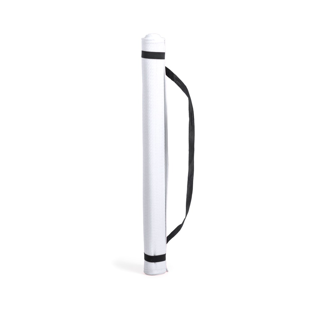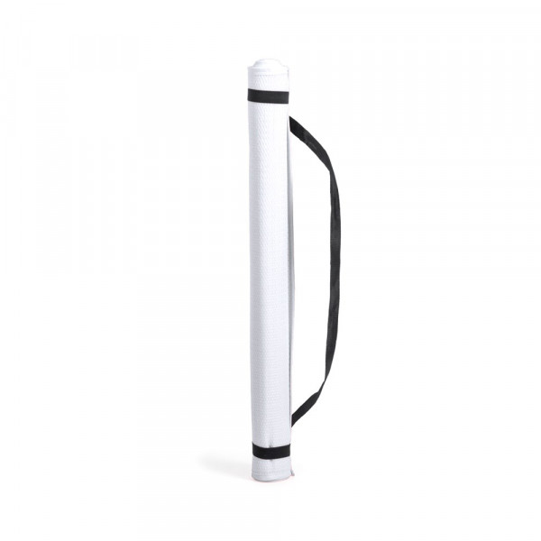 Maxi-Strandmatte mit den Maßen 180 x 60 cm aus hochresistentem geflochtenem Polypropylen (PP). In verschiedenen lebendigen Farben und glänzender Ausführung. Mit Gummibändern zum Fixieren im aufgerollten Zustand und Schultergurt.