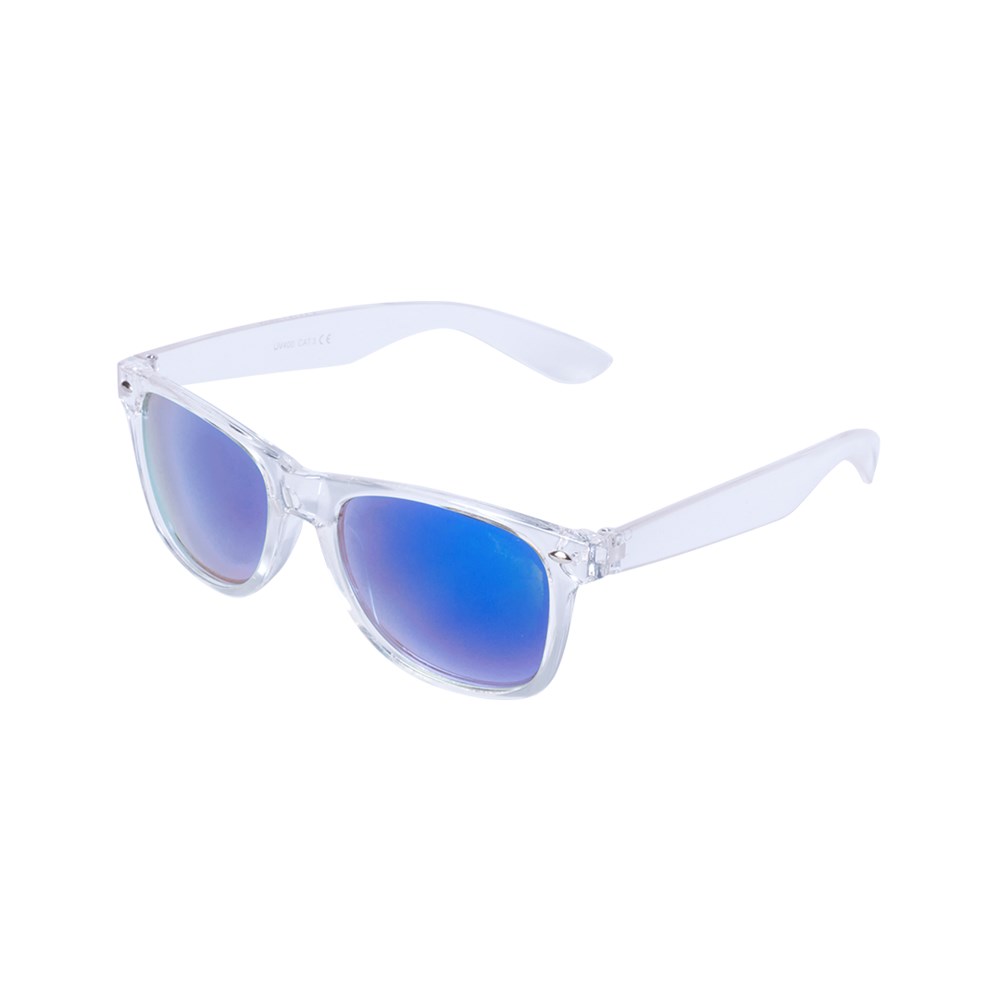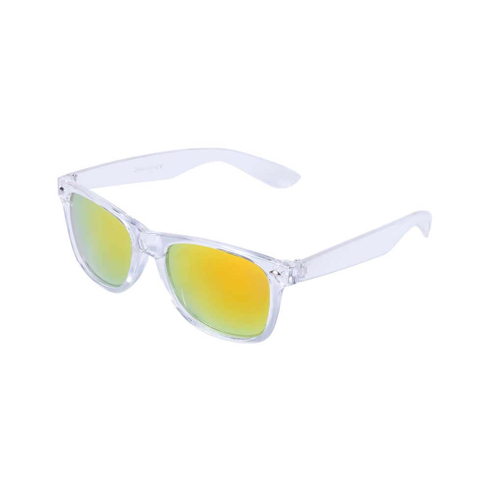 Sonnenbrille mit UV-400-Schutz und klassischem Design. Mit transparentem Rahmen und verspiegelten Gläsern in verschiedenen Farben.