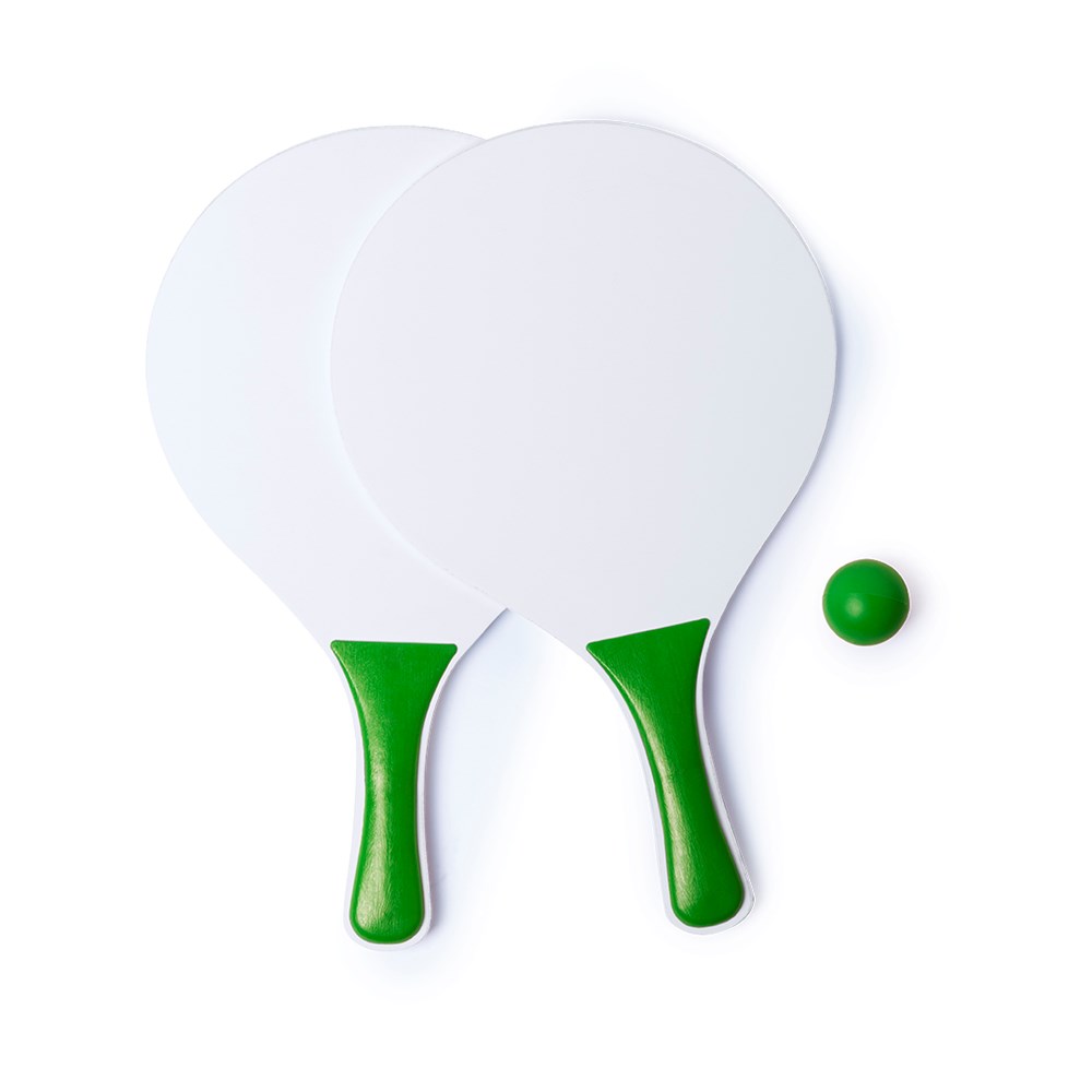 Beachball-Set mit zwei Schlägern aus Naturholz in Weiß. Mit verstärktem Griff in verschiedenen lebendigen Farben. Präsentiert in einer Netztasche mit Ball in passender Farbe.