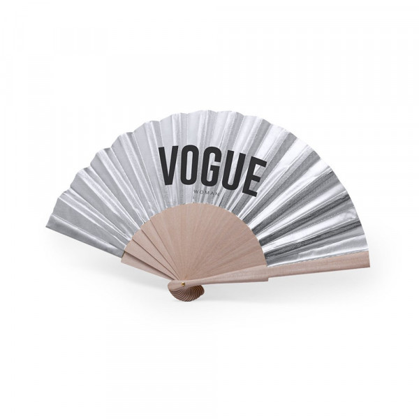 Fächer aus Naturholzstäbchen und Polyestergewebe. Erhältlich in Gold und Silber. Präsentiert in einer individuellen Box.