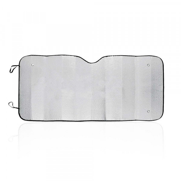 Sonnenschutz aus Aluminum in Silber-Metallic mit schwarzer Paspelierung. Maxi-Größe mit den Maßen 143 x 74 cm. Mit Gummibändern zum Fixieren im gefalteten Zustand, Metallösen zur Verstärkung, sowie zwei Saugnäpfen für die Befestigung an der Windschutzscheibe. Präsentiert in ungefaltetem Zustand für einfaches Bedrucken.