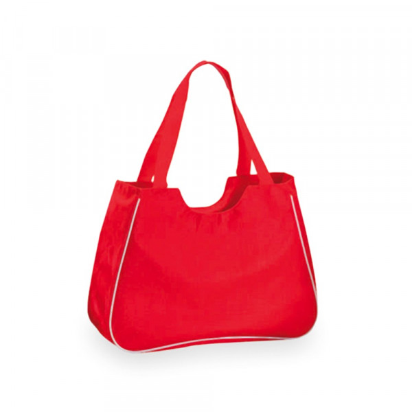 Originelle Strandtasche aus resistentem 600D Polyester in lebendigen Farben. Mit farblich passendem Täschchen im Inneren, Paspel in Weiß, Reißverschluss und langen Henkeln aus Nylon zum Tragen über der Schulter.