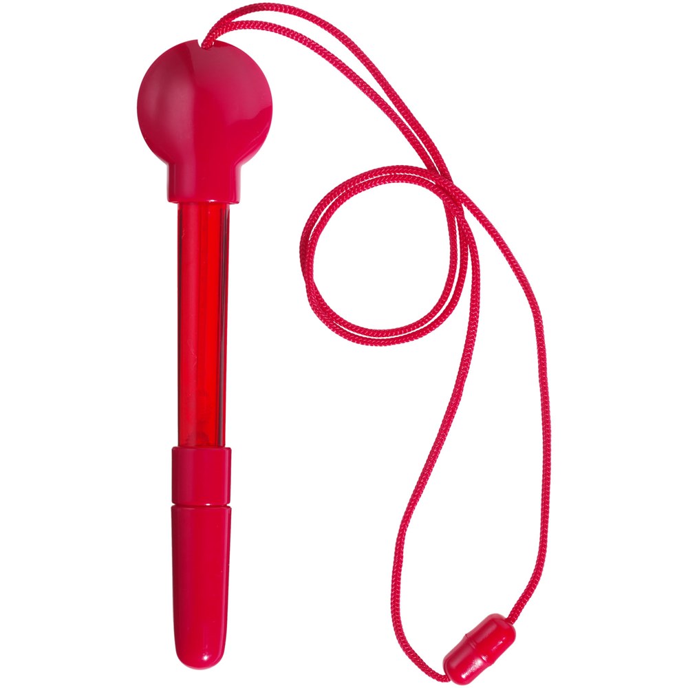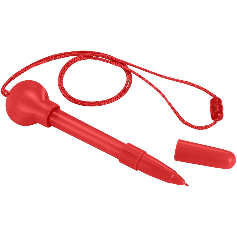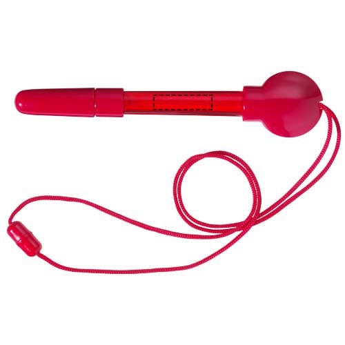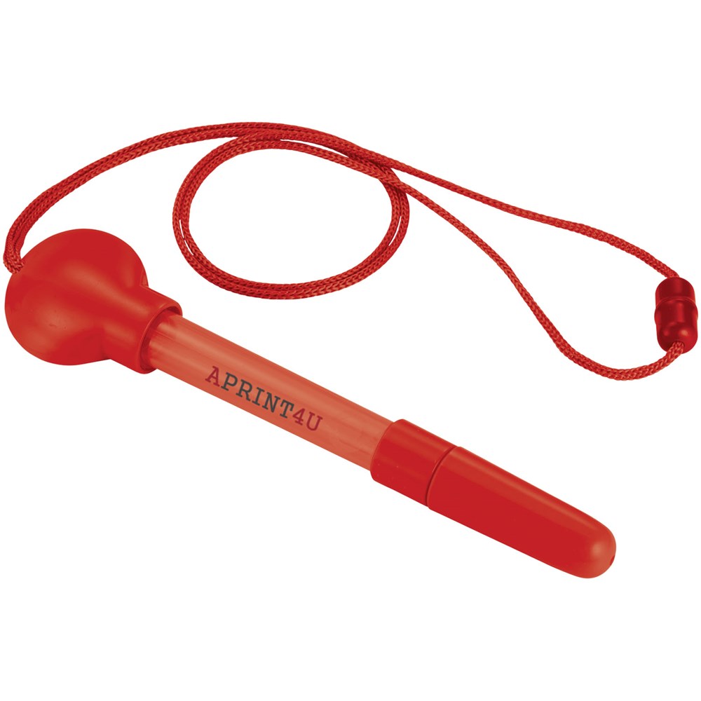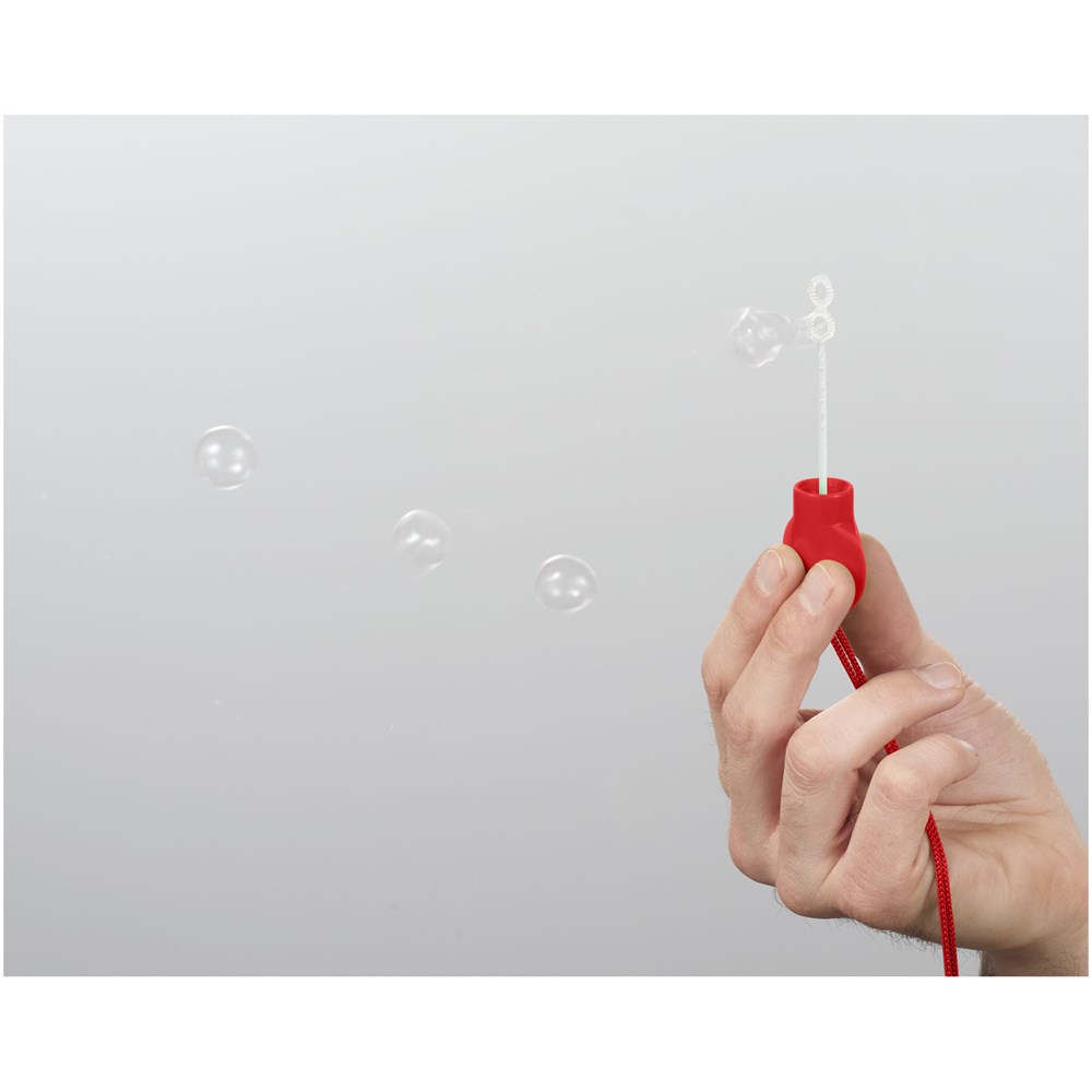 Kugelschreiber mit Seifenblasenspender, abnehmbarer Kappe, Stab und Umhängeband mit Sicherheitsverschluss. Inkl. 5 ml Flüssigkeit.