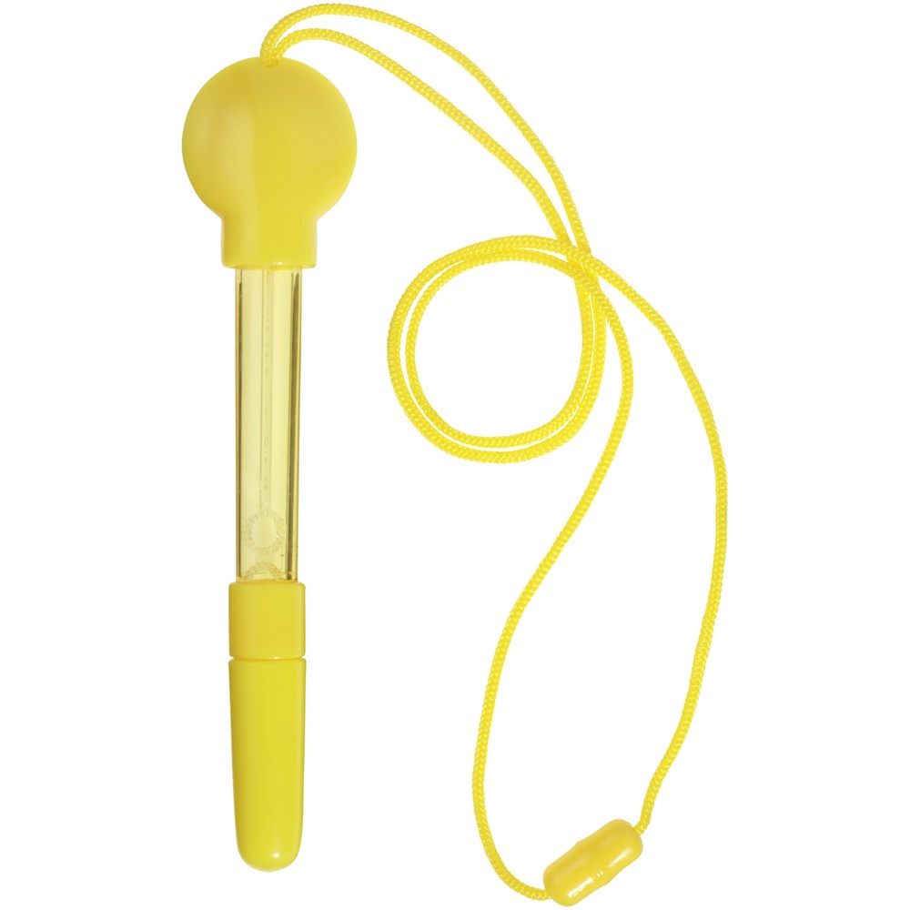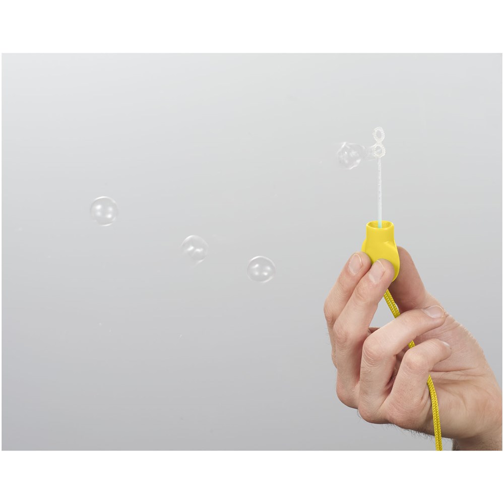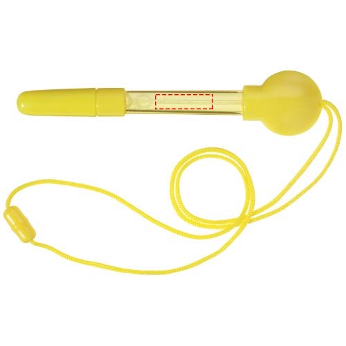 Kugelschreiber mit Seifenblasenspender, abnehmbarer Kappe, Stab und Umhängeband mit Sicherheitsverschluss. Inkl. 5 ml Flüssigkeit.