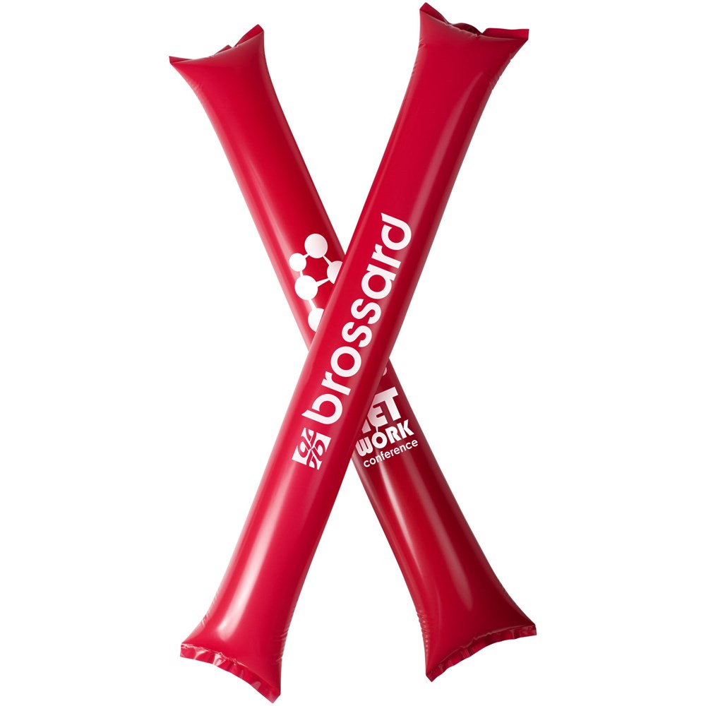 Zwei aufblasbare Klatschstangen. Ideales, wiederverwendbares Produkt zur Unterstützung Ihres Teams. Jede Stange hat eine Größe von 60 x 10 cm mit einem großen Werbeanbringungsbereich. Zur Befüllung mit Luft den mitgelieferten kleinen Strohhalm in die Öffnung der Klatschstange einführen.