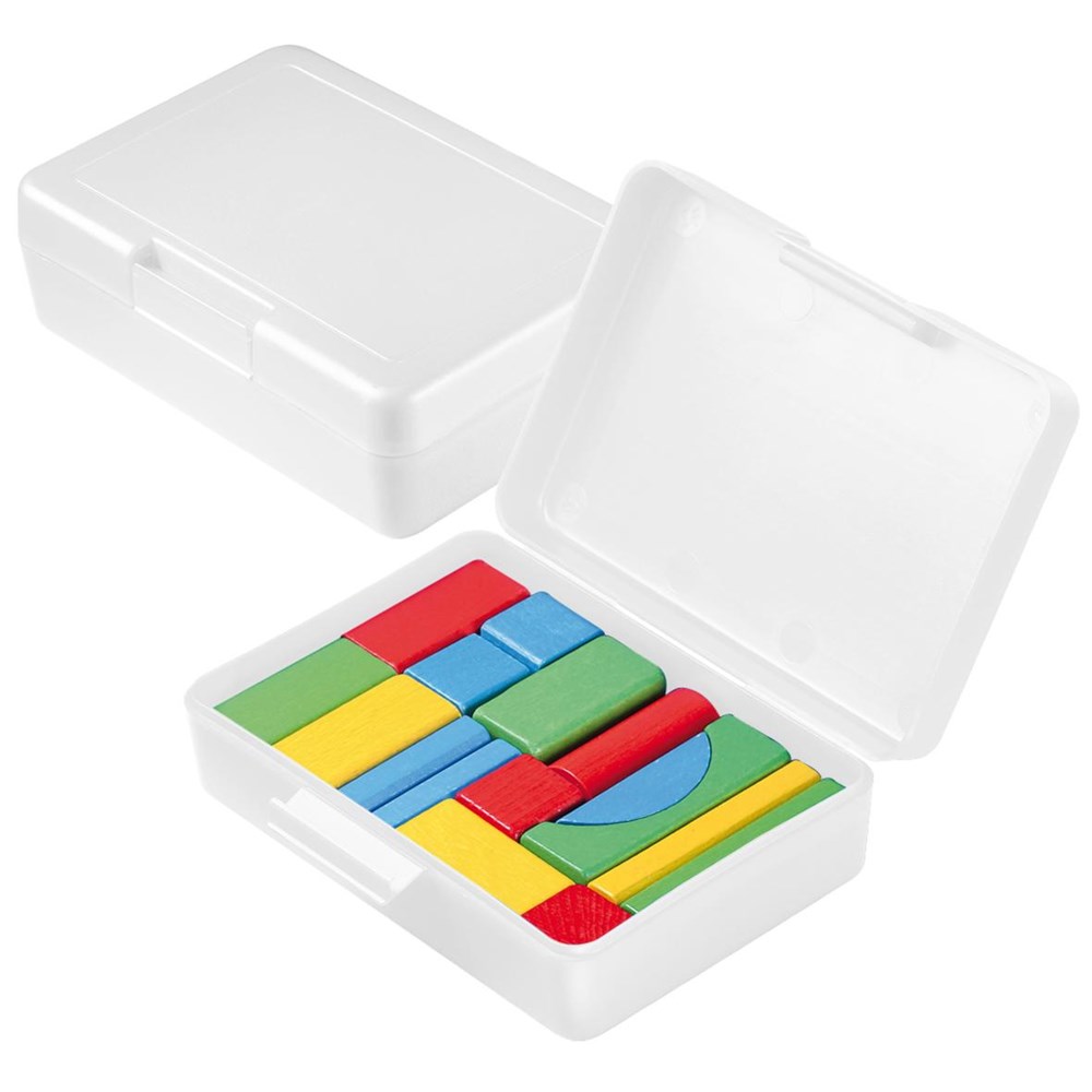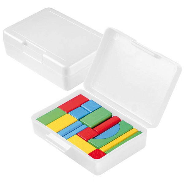 Bunte Holz-Bauklötze für Kinder. Verpackt in einer Kunststoffbox, die auch optimal für andere Zwecke verwendet werden kann. Die individuelle IMould-Veredelung ist auf der Box möglich.