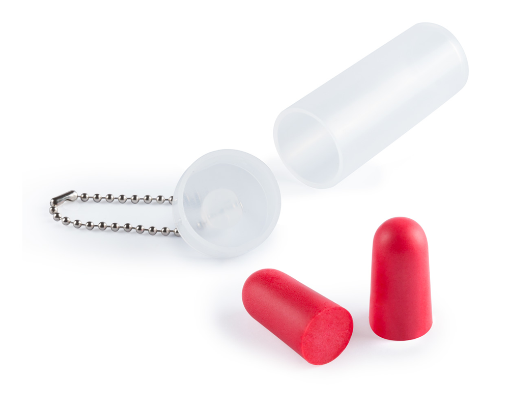 Farbige Ohrstöpsel in transparentem Kunststoffetui mit Metallkette. mehr