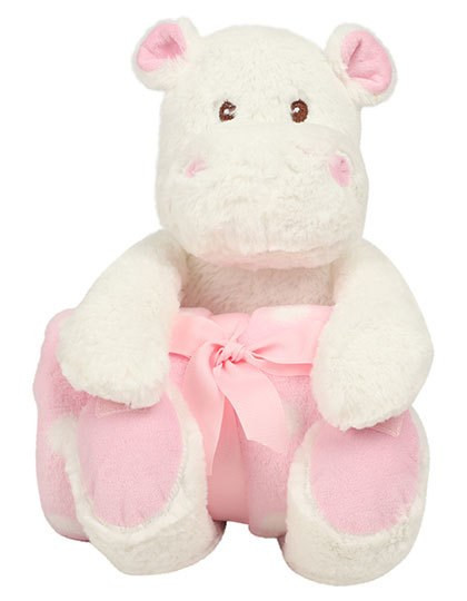 Weiches Nilpferd azs Plüsch mit kontrastfarbener Decke | Kontrastfarbene Füße, Nase und Hörner | Genähte Augen | Blau und weiß gepunktete Velours-Decke | Entfernen Sie alle Aufhänger und deren Befestigungen, bevor Sie diese Artikel einem Kind geben | Klettverschluss an Füßen und Klauen | Entspricht den europäischen Sicherheitsvorschriften nach EN71 für Spielzeuge | Geeignet für Kinder aller Altersgruppen | Decke: 70 x 90 cm
