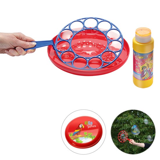 für Riesenblasen, 3-teilig: 1 Blasenring, 1 Flugscheibe, 1 Flasche mit ca. 240 ml Lauge und Geduldspiel im Deckel; Farbkombinationen möglich. Nicht geeignet für Kinder unter 3 Jahren!