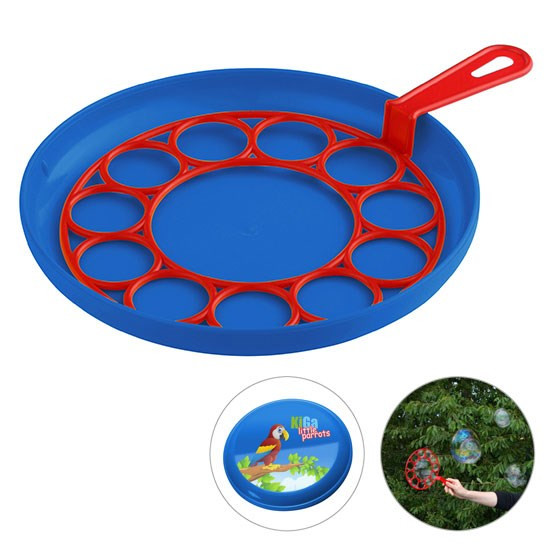 für Riesenblasen, 3-teilig: 1 Blasenring, 1 Flugscheibe, 1 Flasche mit ca. 240 ml Lauge und Geduldspiel im Deckel; Farbkombinationen möglich. Nicht geeignet für Kinder unter 3 Jahren!