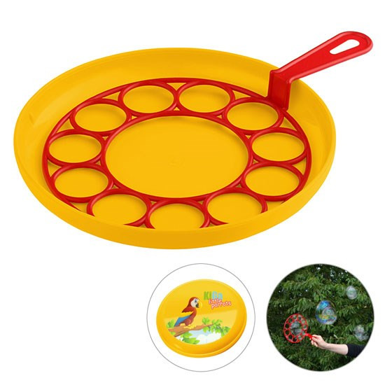 für Riesenblasen, 3-teilig: 1 Blasenring, 1 Flugscheibe, 1 Flasche mit ca. 240 ml Lauge und Geduldspiel im Deckel; Farbkombinationen möglich. Nicht geeignet für Kinder unter 3 Jahren!