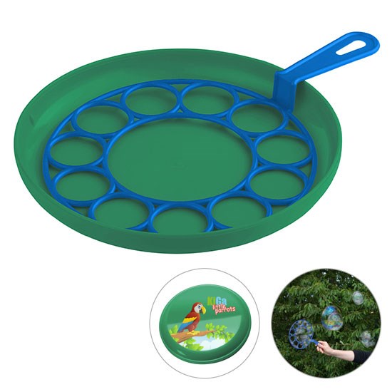 für Riesenblasen, 3-teilig: 1 Blasenring, 1 Flugscheibe, 1 Flasche mit ca. 240 ml Lauge und Geduldspiel im Deckel; Farbkombinationen möglich. Nicht geeignet für Kinder unter 3 Jahren!