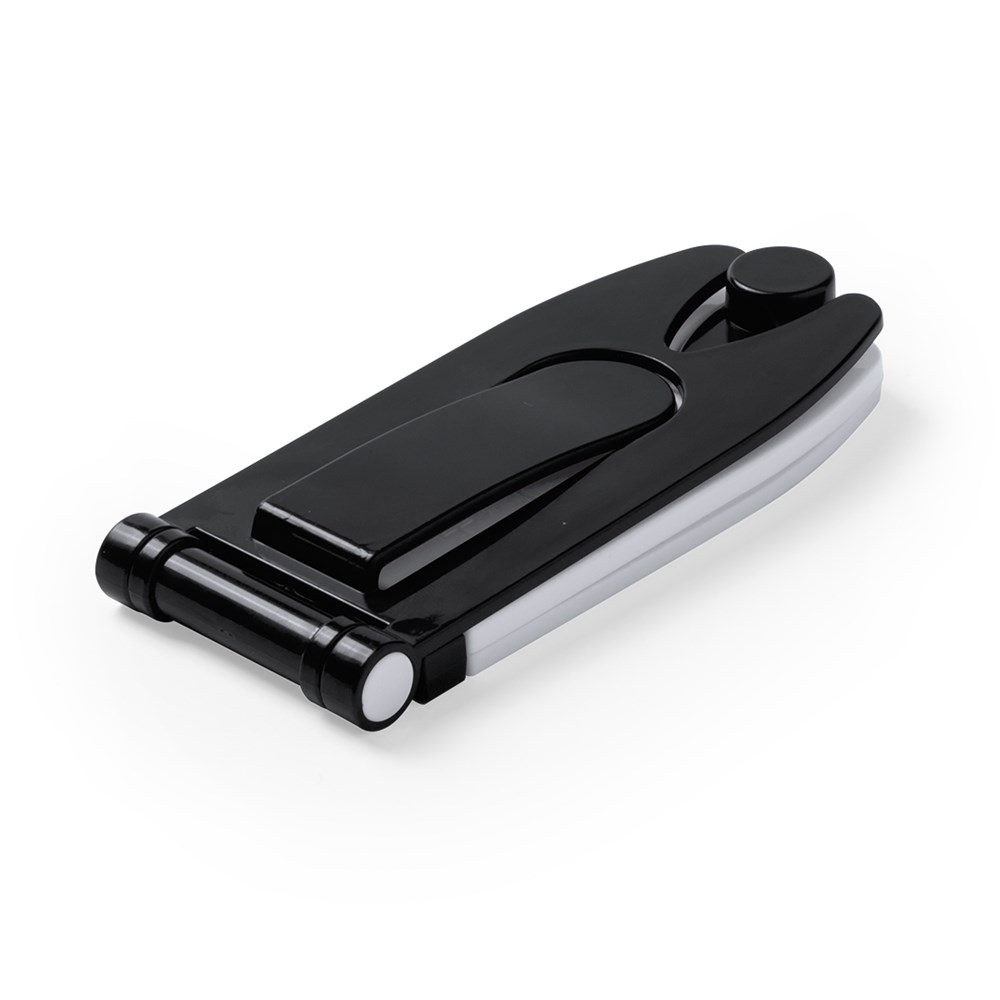 LED-Leselampe mit zweifarbigem Design und klappbarem Gehäuse mit einstellbarem Licht und praktischer Klemme für die Befestigung am Buch. Präsentiert in einem Design-Beutel mit Ziplock-Verschluss.