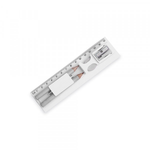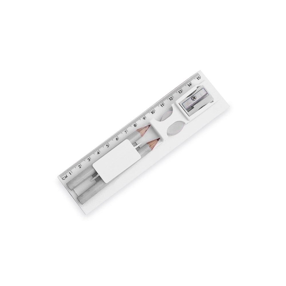 5-teiliges Set in lebendigen Farben mit 2 schwarzen Bleistiften mit zylinderförmigem Schaft, Radiergummi und Anspitzer. Präsentiert in einem Lineal-Gehäuse mit Fächern.