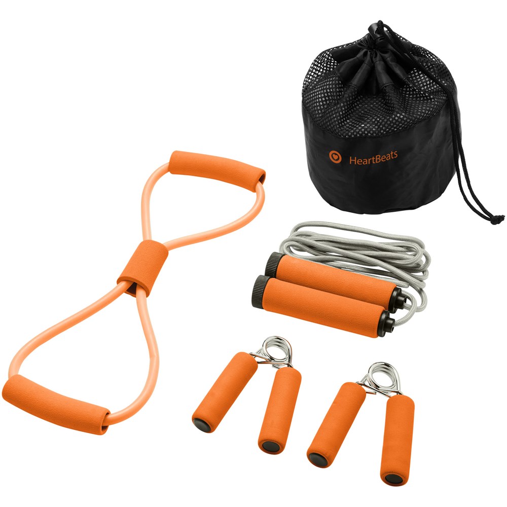 Fitness-Set mit allen Tools für ein perfektes Training. Zwei Handgrifftrainer, Springseil und Brust-Expander in farblich passendem Material. Wird in einem Netzbeutel für einfaches Tragen geliefert und hat eine große Dekorationsfläche.