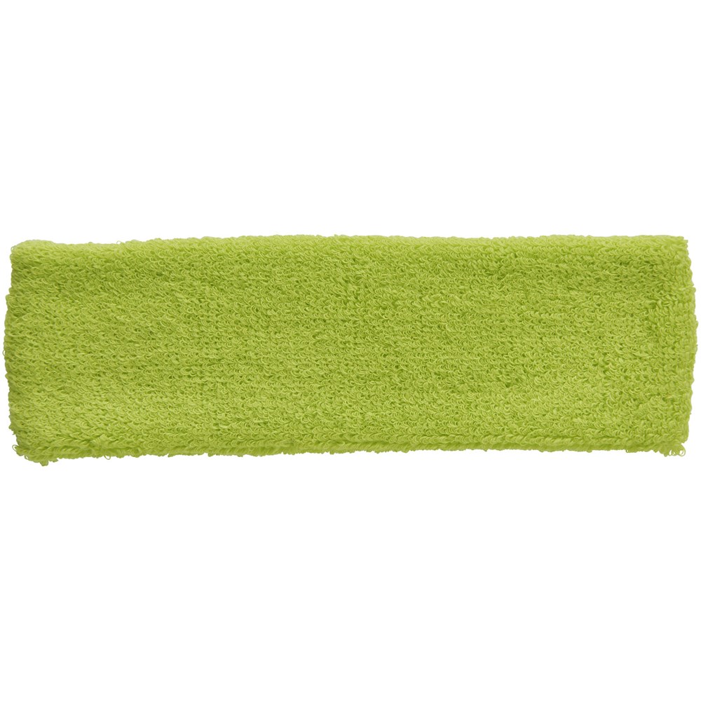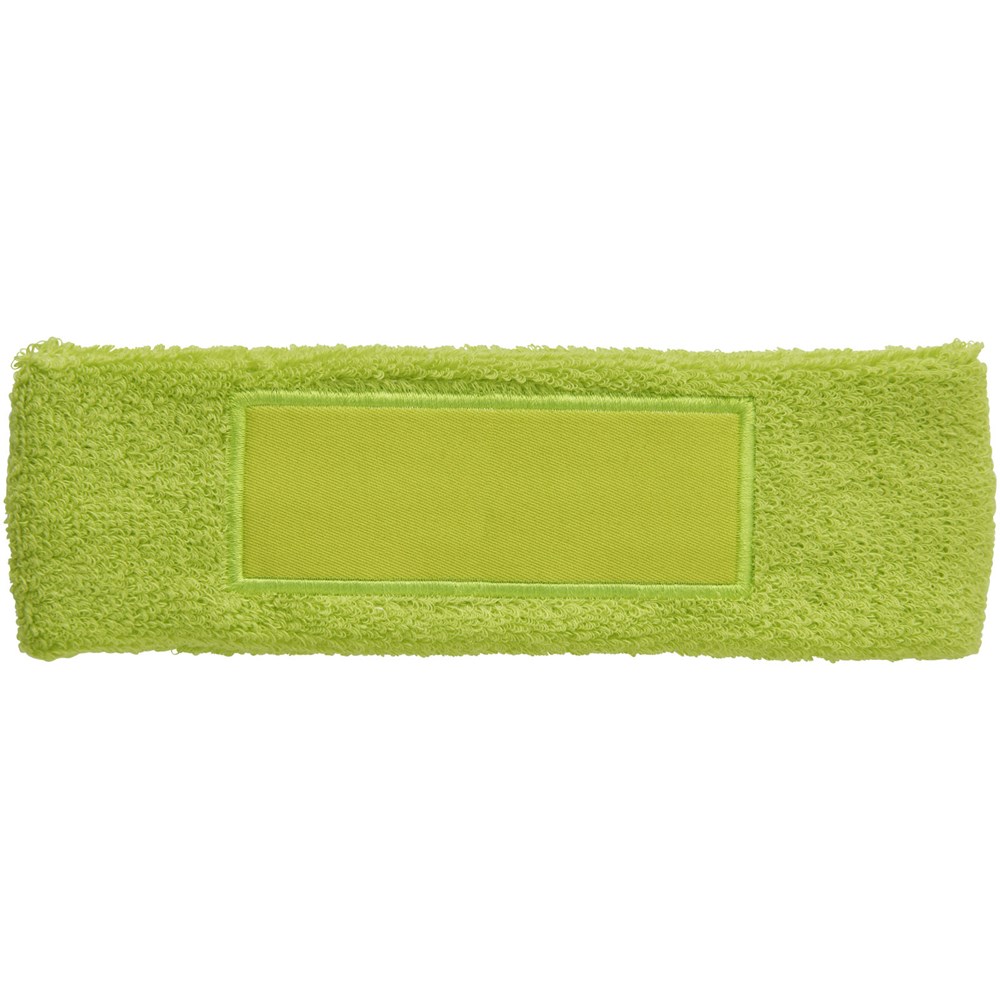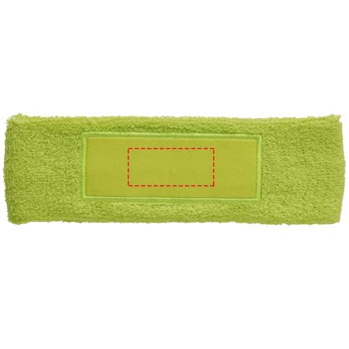 Weiches und saugfähiges elastisches Baumwoll Stirnband mit rechteckigem 90x30mm Aufnäher für Werbeanbringung.