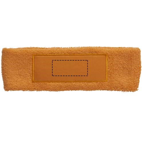 Weiches und saugfähiges elastisches Baumwoll Stirnband mit rechteckigem 90x30mm Aufnäher für Werbeanbringung.