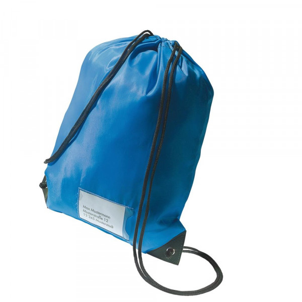 Sportbeutel mit austauschbarem Namenschild, Kordel und verstärkten Ecken gegen Ausreißen beim Tragen. Als Rucksack oder Umhängetasche verwendbar.
