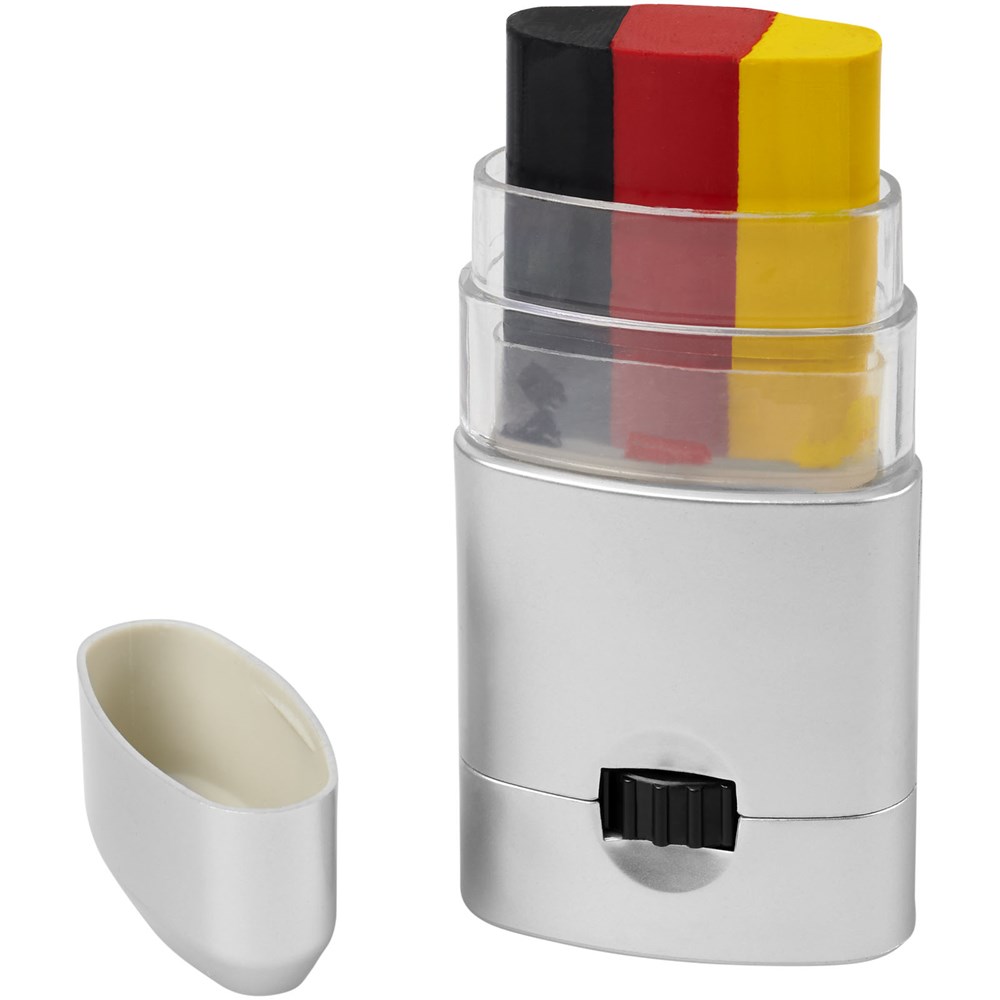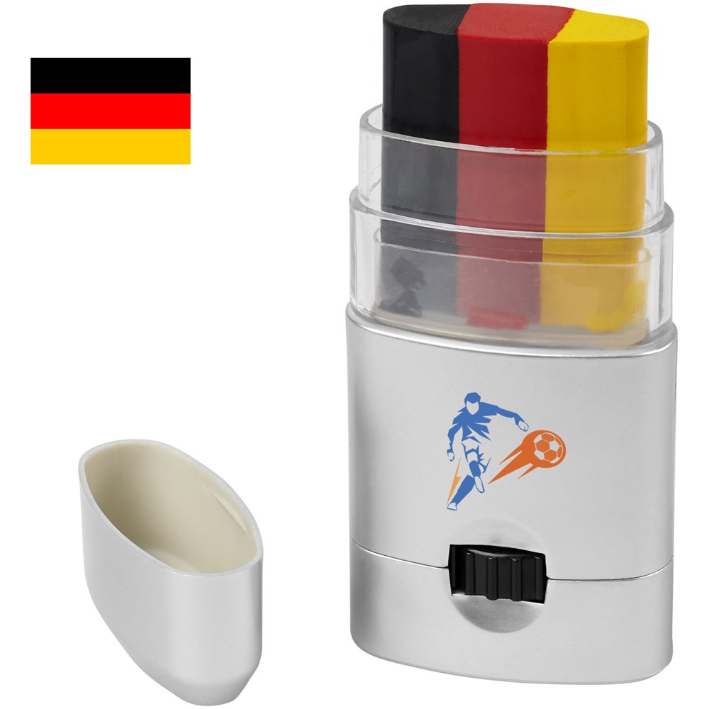 Leicht zu reinigende Körperfarbe in einer Vielzahl von Farbkombinationen, welche die Länder Frankreich, Deutschland, Italien, Niederlande, Belgien, Portugal, Spanien, Österreich, Dänemark, Schweiz, Schweden und Polen repräsentieren. Kann auch auf das Gesicht aufgetragen und mit einem Make-up-Reiniger oder mit Wasser und Seife entfernt werden. Hergestellt unter GMP-Konformitätsanforderungen (Good Manufacturing Practices), erfüllt die EU-Verordnungen über kosmetische Mittel (Verordnung (EC) Nr. 1223/2009). CPNP-Registrierungsnummer 3260279.