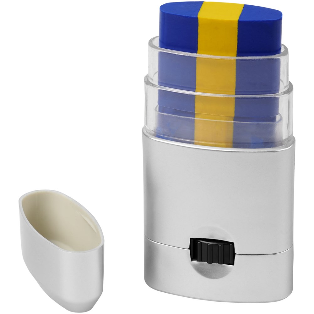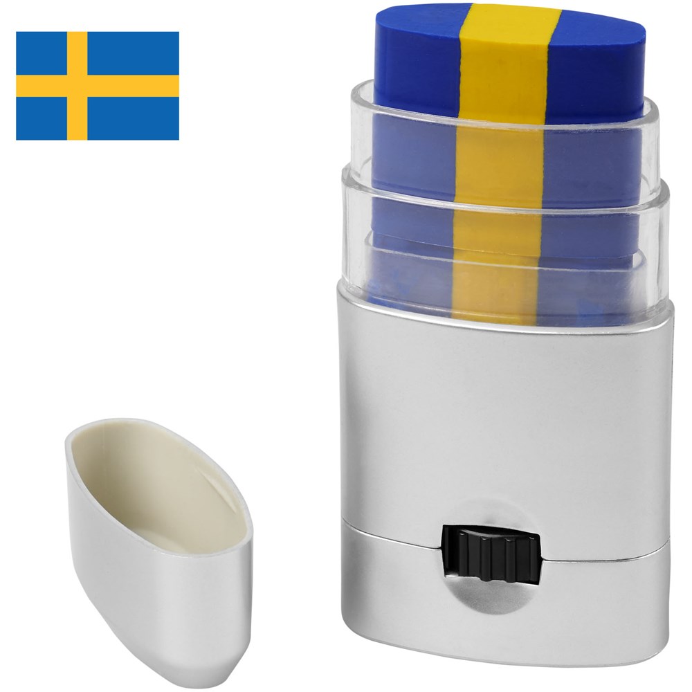 Leicht zu reinigende Körperfarbe in einer Vielzahl von Farbkombinationen, welche die Länder Frankreich, Deutschland, Italien, Niederlande, Belgien, Portugal, Spanien, Österreich, Dänemark, Schweiz, Schweden und Polen repräsentieren. Kann auch auf das Gesicht aufgetragen und mit einem Make-up-Reiniger oder mit Wasser und Seife entfernt werden. Hergestellt unter GMP-Konformitätsanforderungen (Good Manufacturing Practices), erfüllt die EU-Verordnungen über kosmetische Mittel (Verordnung (EC) Nr. 1223/2009). CPNP-Registrierungsnummer 3260279.