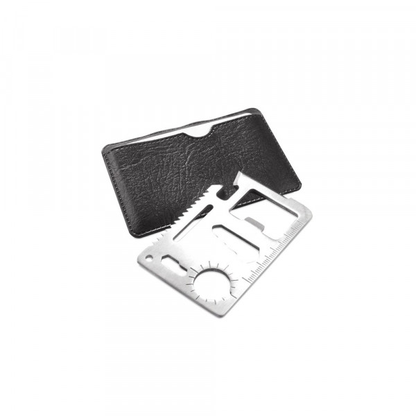 Multi-Tool aus robustem Edelstahl mit 11 Funktionen. Enthält unter anderem Dosenöffner, Messer, Schraubendreher, Lineal, Flaschenöffner, Schraubenschlüssel, Flügelmutterschlüssel, Säge und Orientierungshilfe. Präsentiert in einem widerstandsfähigem Kunstlederetui.
