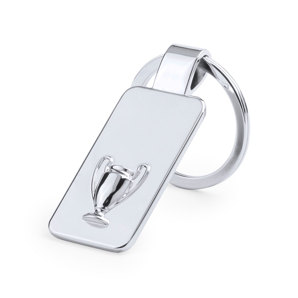 Relief-Schlüsselanhänger aus Metall in glänzendem Silber, mit einer Vielzahl von verschiedenen Sport-Designs. Präsentiert in einer individuellen schwarzen Schachtel mit Stanzung und Samtauskleidung.