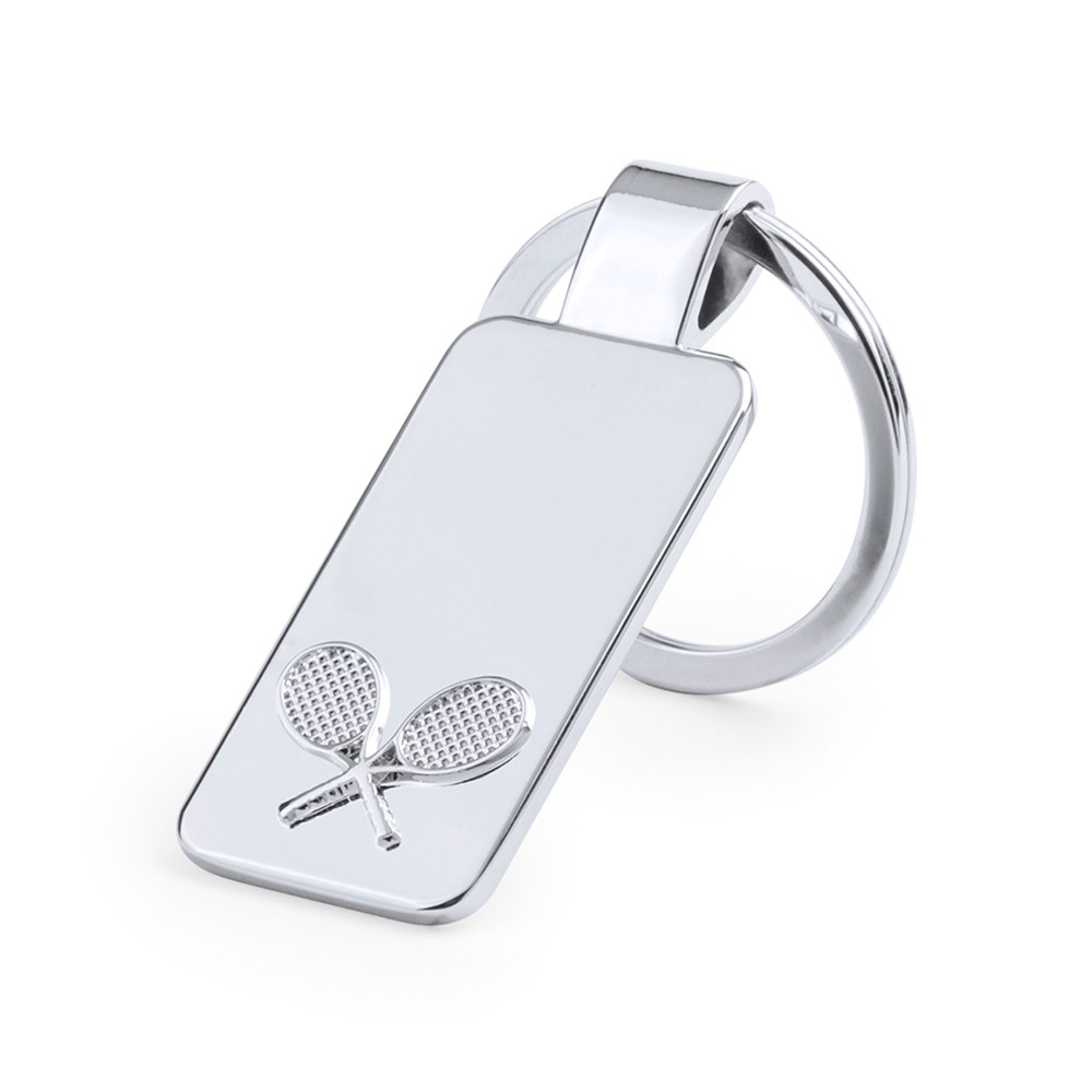 Relief-Schlüsselanhänger aus Metall in glänzendem Silber, mit einer Vielzahl von verschiedenen Sport-Designs. Präsentiert in einer individuellen schwarzen Schachtel mit Stanzung und Samtauskleidung.