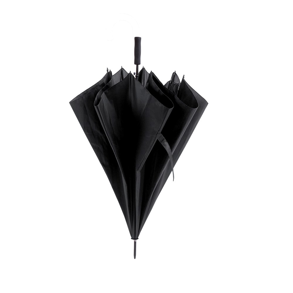 Winddichter XL-Regenschirm mit 8 Panelen aus robustem Polyester. Mit 130 cm Durchmesser, manueller Öffnung und resistentem Fiberglasgestänge in Schwarz. Mit gepolstertem Griff aus EVA und Klettverschluss.