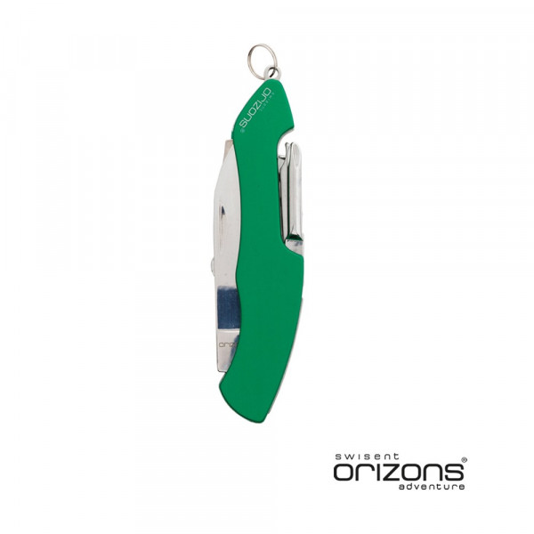 Vielseitig verwendbares Taschenmesser von Orizons mit 10 Edelstahl-Funktionen und Aluminiumgriff in lebendigen Farben. Mit Messer, Schere, Dosenöffner, Flaschenöffner mit Schlitzschraubendreher, Kreuzschraubendreher, Schlagdorn mit Feile und Korkenzieher. Mit Schlüsselring. Präsentiert in einer attraktiven Designbox mit dem Markenlogo.