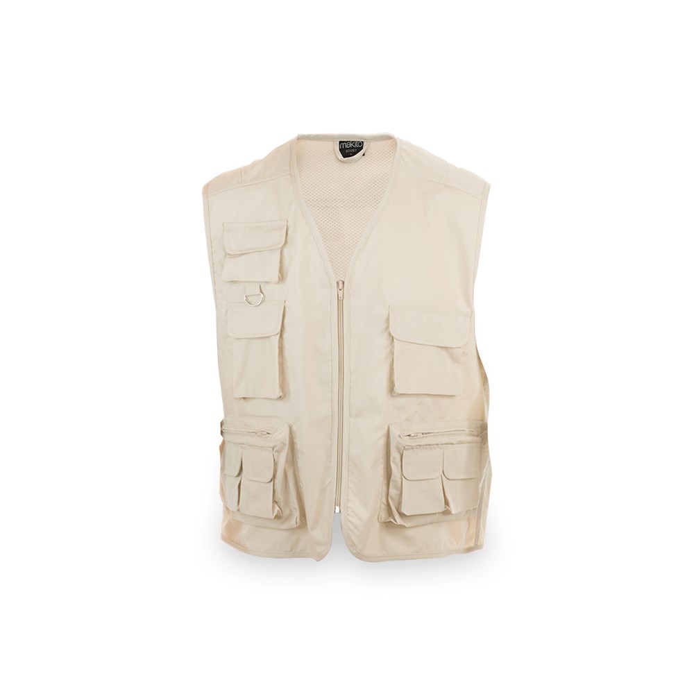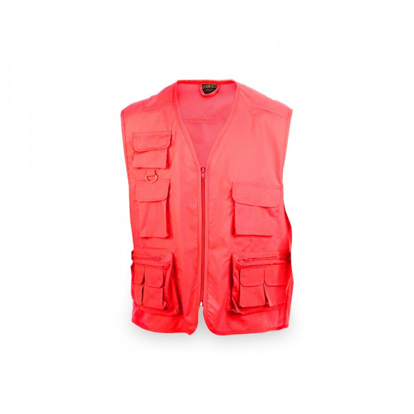 Weste aus einer resistenten Baumwoll/Polyester-Kombination in kräftigen Farben. Mit Reißverschluss, mehreren Vorder- und Seitentaschen mit großem Fassungsvermögen und Klettverschluss sowie Metallring auf der Brust. Erhältlich in den Größen L, XL und XXL.