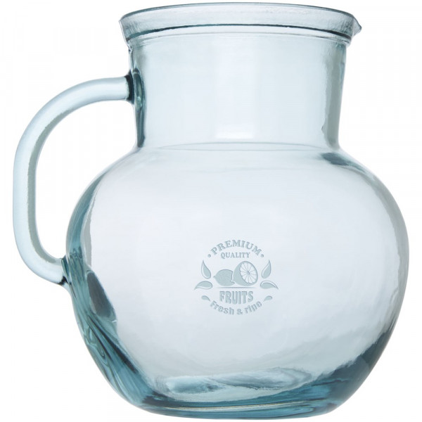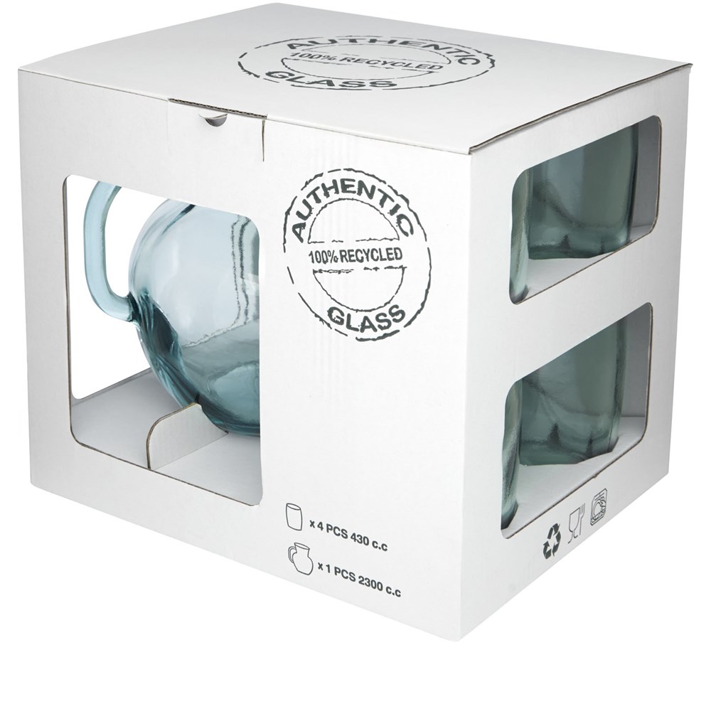 5-teiliges Set aus recyceltem Glas mit einem 2,3-Liter-Krug und vier 430-ml-Tassen. Hergestellt aus 5 Flaschen aus Glas. Recyceltes Glas wird mit weniger Energie, Rohstoffen und Additiven hergestellt als für die Herstellung von herkömmlichem Glas erforderlich.