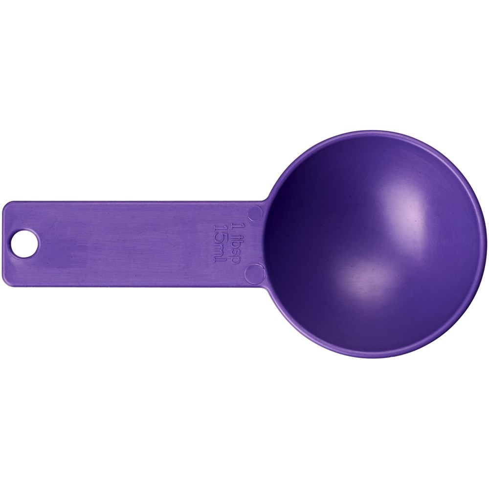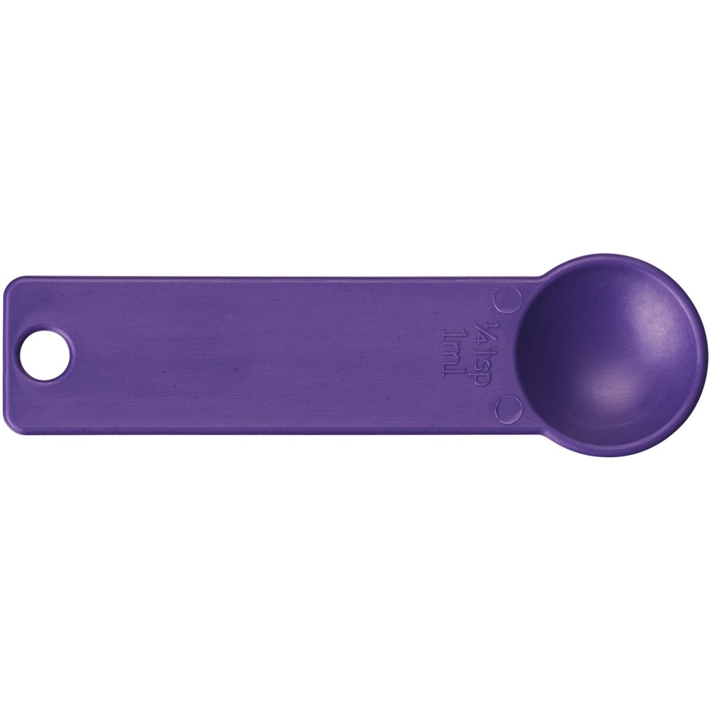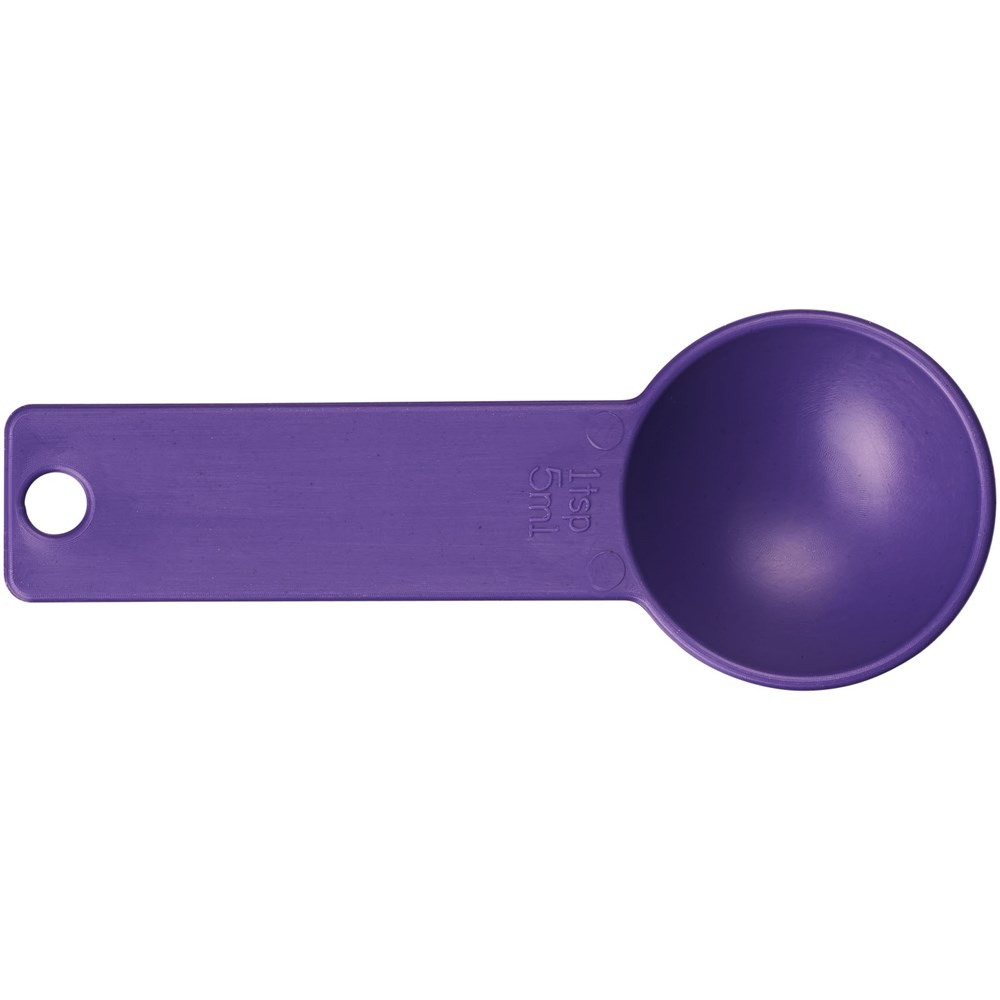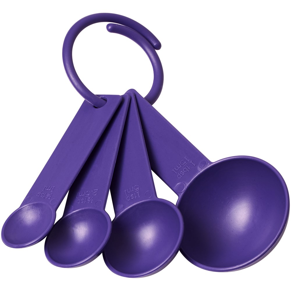 Ein Satz Messlöffel in vier Größen, alle an einem Ring befestigt. Die enthaltenen Maße sind 1/4 TL, 1/2 TL, 1 TL und 1 EL. In verschiedenen Farben erhältlich.
