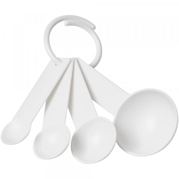 Ein Satz Messlöffel in vier Größen, alle an einem Ring befestigt. Die enthaltenen Maße sind 1/4 TL, 1/2 TL, 1 TL und 1 EL. In verschiedenen Farben erhältlich.