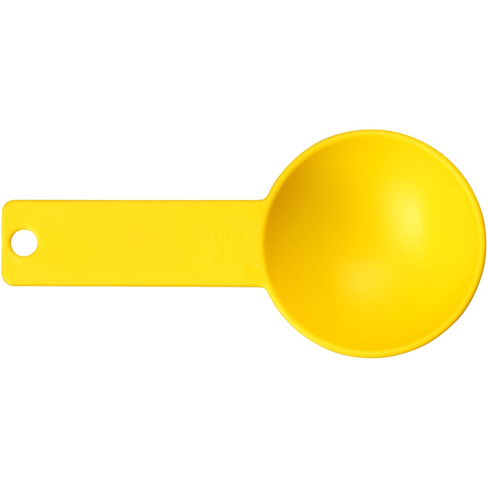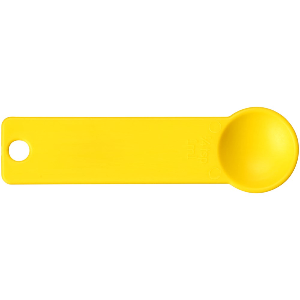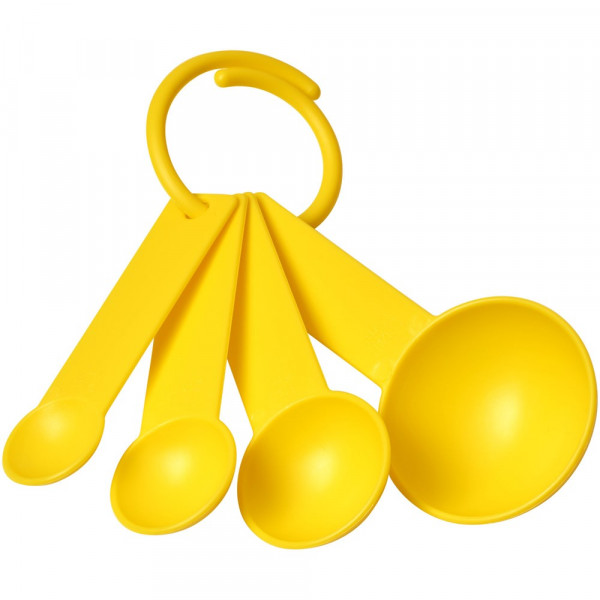 Ein Satz Messlöffel in vier Größen, alle an einem Ring befestigt. Die enthaltenen Maße sind 1/4 TL, 1/2 TL, 1 TL und 1 EL. In verschiedenen Farben erhältlich.