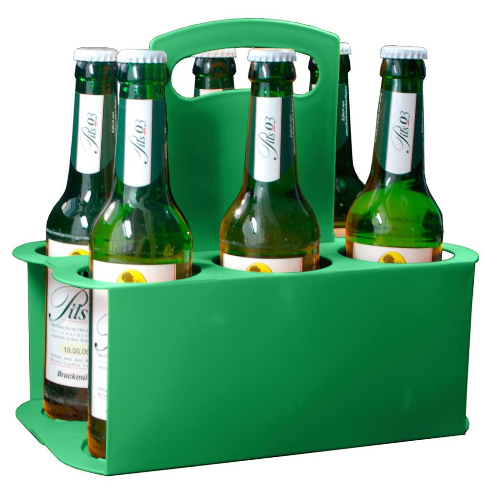 Zusammenfaltbarer Flaschenträger für bis zu 6 Bier-oder Limoflaschen. Idealer Zugabeartikel mit Gebrauchsanweisung. Einfache Montage.