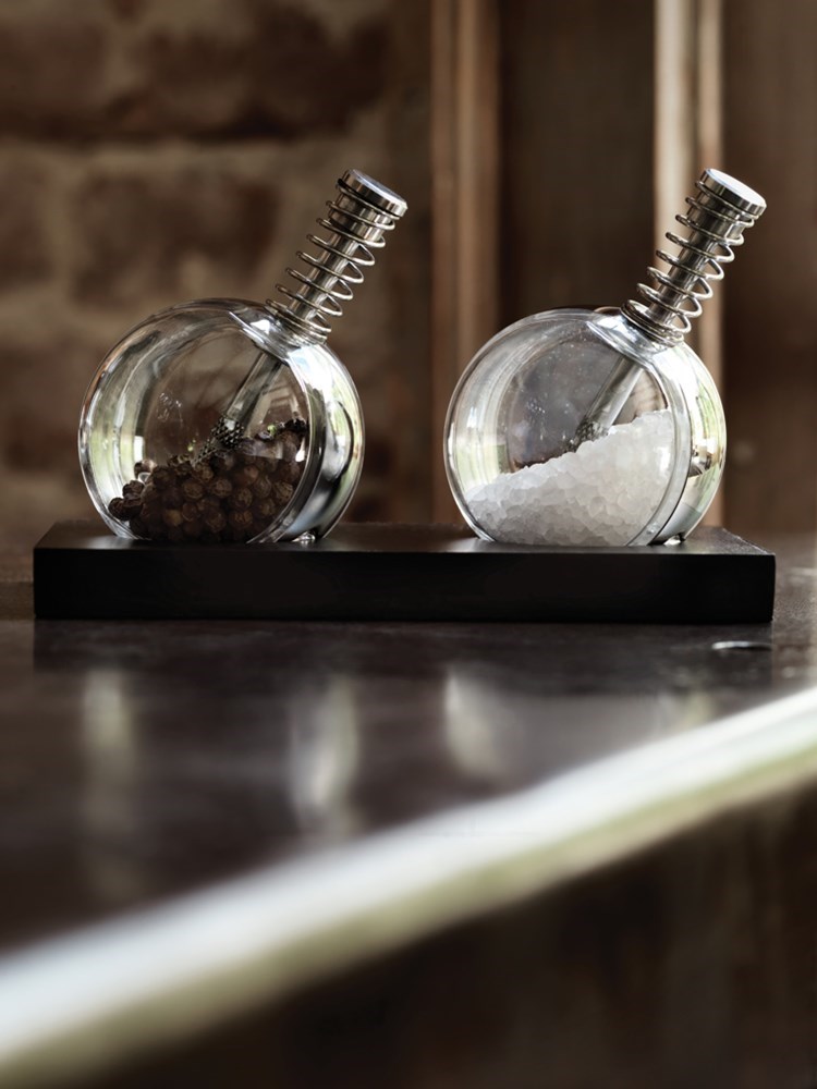 Dieses stylische Salz & Pfeffer Set hat einen einzigartigen Druckmechanismus in jeder Mühle und sie sind somit leicht einhändig zu bedienen. Durch das durchsichtige Design der Behälter sehen Sie jederzeit, wieviel Salz & Pfeffer noch vorhanden ist. Geschütztes Design®