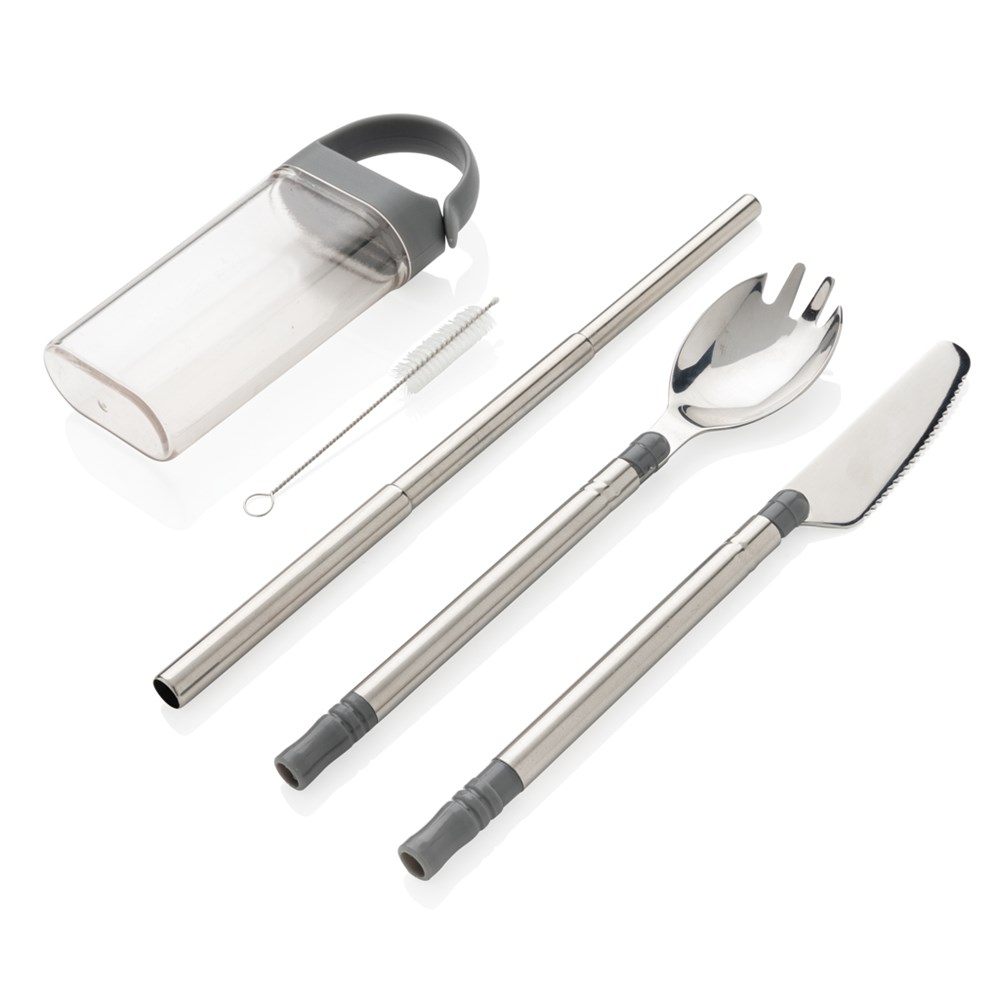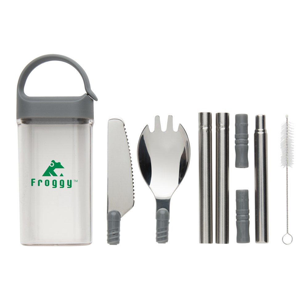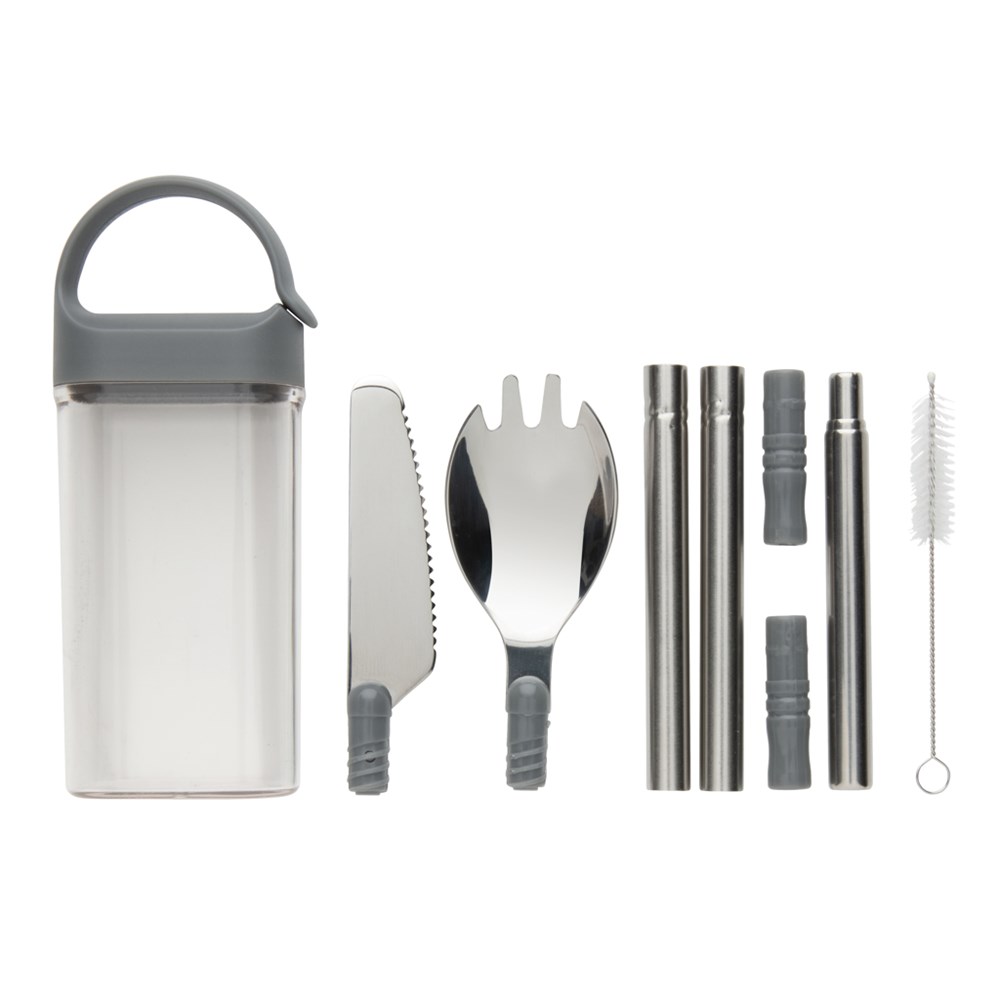 Choose to re-use! Nutzen Sie kein Einwegbesteck sondern haben Sie dieses Besteck im Kleinformat immer sauber im mitgelieferten Case bei sich. Set bestehend aus: Stainless Messer, Göffel, faltbarem Trinkhalm und kleiner Bürste.