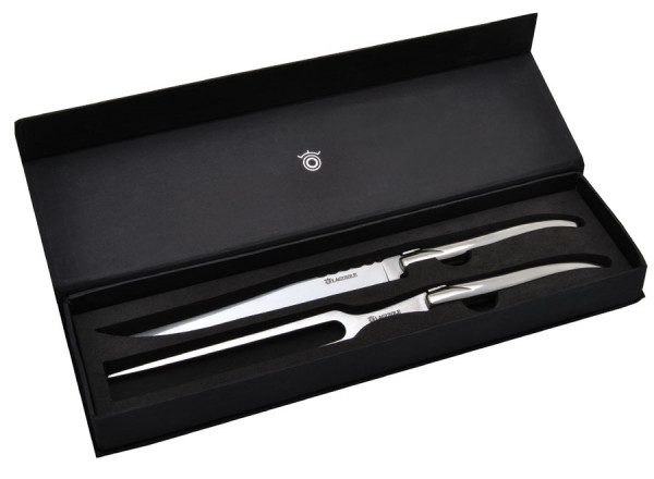 Ein hochwertiges Laguiole-Tranchierset bestehend aus einer Fleischgabel sowie einem Fleischmesser, Klinge und Gabel aus 420er Edelstahl. Lebensmittelkonform (Norm EN10088-2 2005). Geliefert in schwarzer Geschenkbox mit Magnetverschluss. Hinweis: Diese Qualitätsprodukte sind nicht spülmaschinengeeignet.