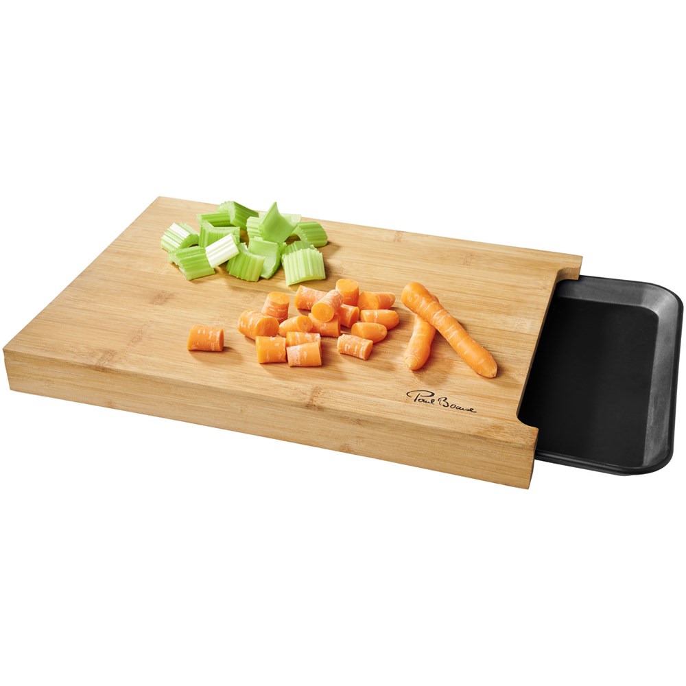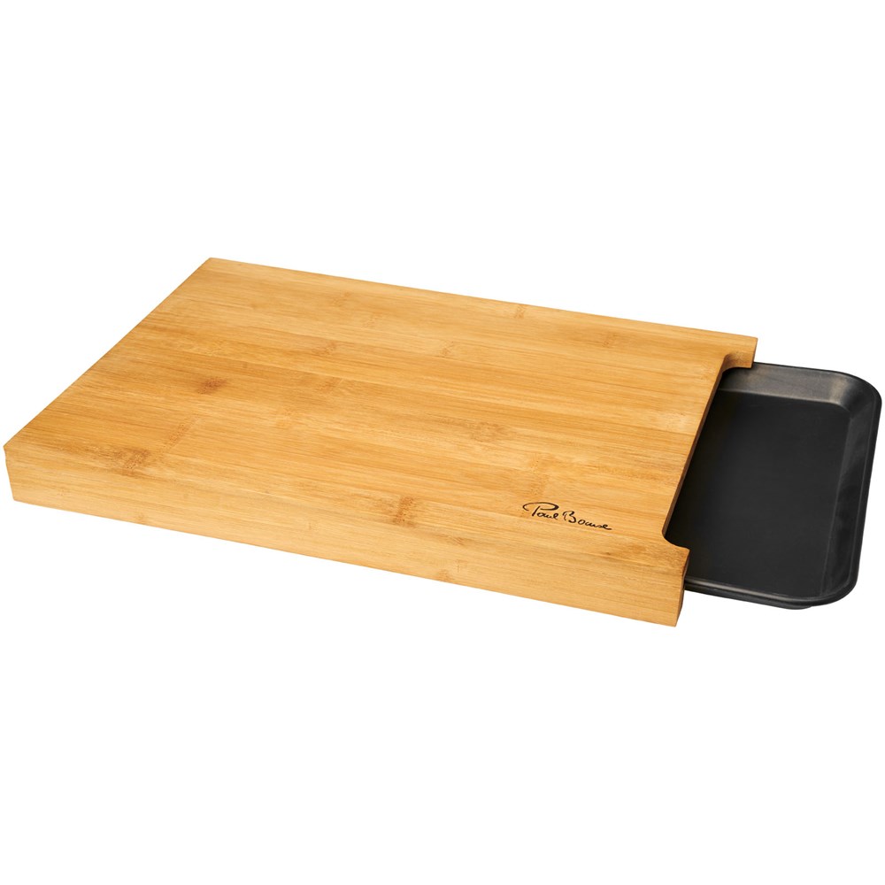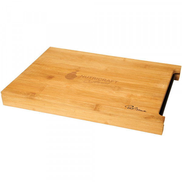 Vielseitiges Bambusbrett mit einer praktischen Ablage, die unter das Brett geschoben werden kann.