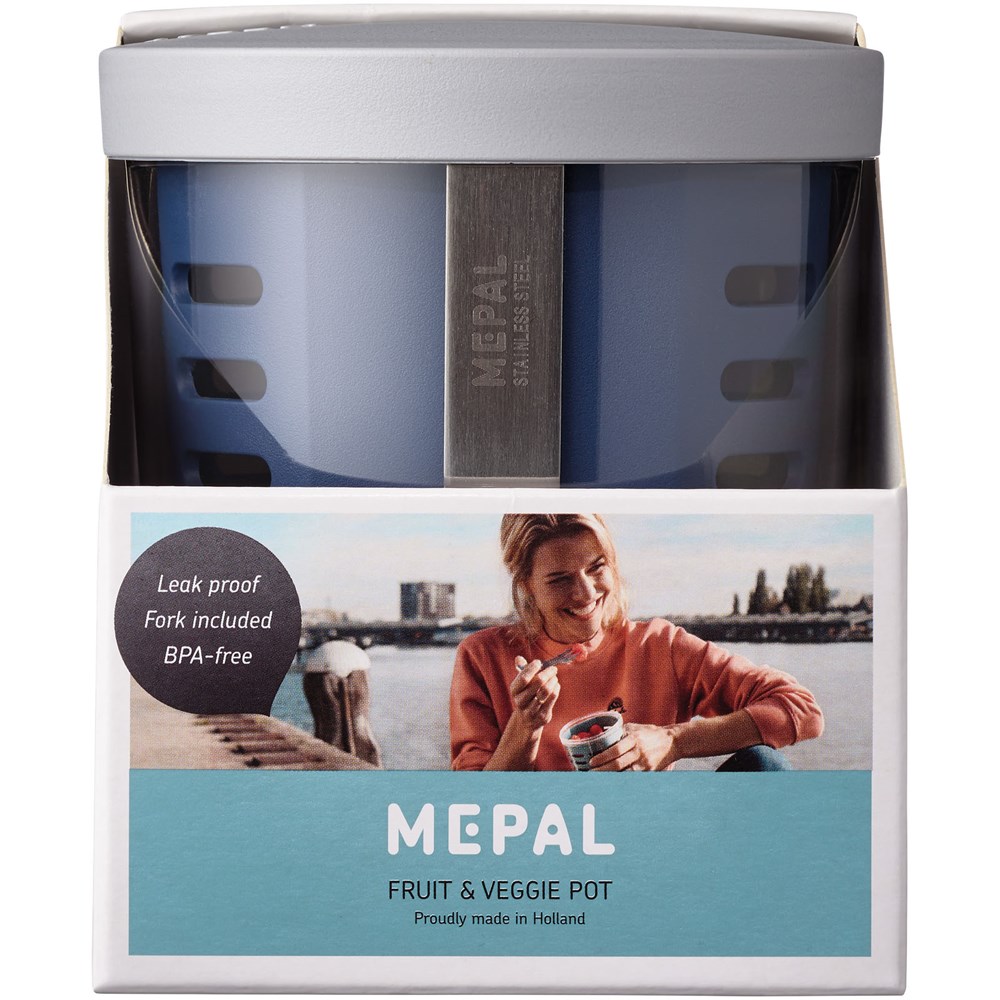 Obst- oder Gemüsebehälter mit Edelstahl-Gabel und Abtropfsieb, das das Ausspülen des Inhalts erleichtert. Zwischen Behälter und Sieb befindet sich ein kleiner Zwischenraum, damit die Speisen direkt abtropfen können. Das Sieb kann herausgenommen werden und der Behälter kann als Salatbehälter verwendet werden. Der Deckel ist kompatibel mit anderen Mepal Pots. Aus strapazierfähigem Material und spülmaschinenfest. Das Fassungsvermögen beträgt 600 ml. Auslaufsicher. BPA frei.
