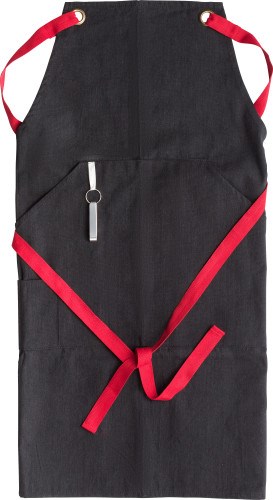 Schürze aus Polyester und Baumwolle mit farbigen Bändern und Fronttasche. Inklusive Flaschenöffner.