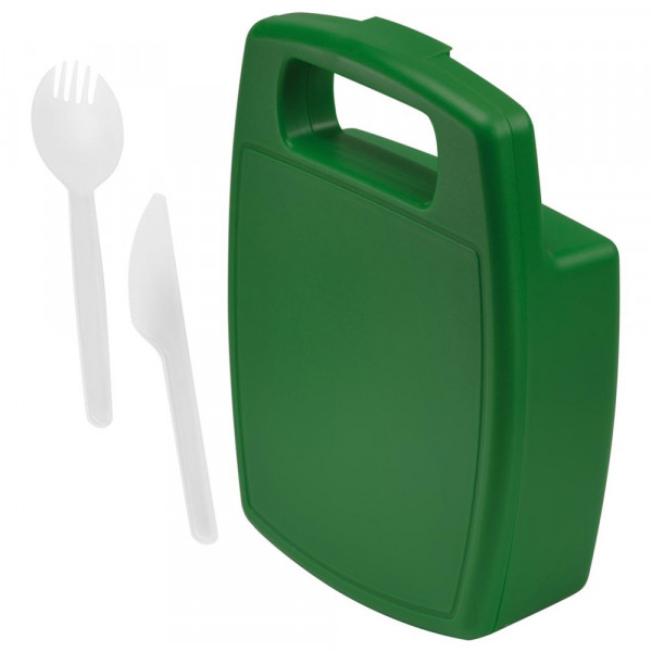 Praktische Brotzeitdose mit Griff und Klappdeckel mit Schnappverschluss. Im Deckel der Box ist zudem das passende Besteck integriert. Die Vorratsdose und das Besteck sind komplett aus Kunststoff gefertigt.
