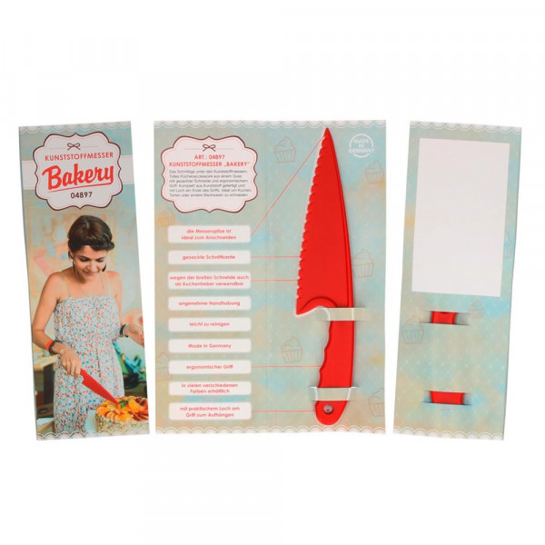 Das Schnittige unter den Kunststoffmessern. Tolles Küchenaccessoire aus einem Guss mit gezackter Schneide und ergonomischem Griff. Komplett aus Kunststoff gefertigt und mit Loch am Ende des Griffs.