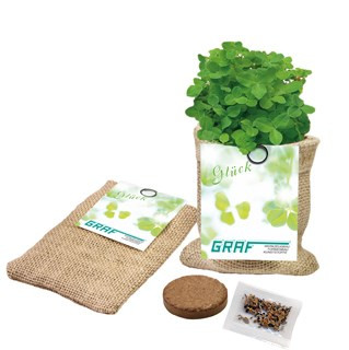 Ein Glücksbringer mit dem Natursäckchen. Suchen Sie Ihr Glück aus dem Jute-Säckchen. Die Handhabung, für die Anzucht der Pflanze, ist auf dem Kärtchen zu finden. Ein flacher Naturartikel, der durch das Wachstum zum Pflanzbeutel wird. Mit dem Kärtchen können Sie die Werbebotschaft auf der Vorderseite anheften, dadurch ist sie ständig im Blickfeld. Platz für Ihren Eindruck ist auf dem Standardmotiv oder alternativ Ihre eigene Gestaltung des Kärtchens, jeweils ab 250 Stück.