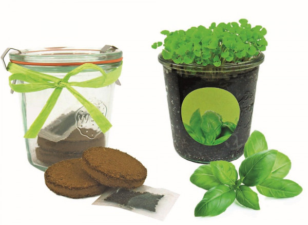 Ein Weckglas als transparentes Wachstumsbehältnis für die Pflanzen. Die aromatischen Basilikum-Blätter passen hervorragend zu Tomatengerichten. Das Haftetikett ist ein ständig sichtbarer Überbringer Ihrer Werbebotschaft. Ein Eindruck in das Standardmotiv oder eine individuelle Gestaltung des Etiketts ist jeweils bereits ab 250 Stück möglich.