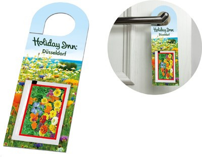Heißen Sie Ihre Gäste mit einem wachsenden Blumengruß willkommen. Wenn die Samen des Türanhängers ausgesät sind und anfangen zu wachsen, weckt dieser kleine Willkommensgruß wieder die Erinnerung an den schönen Besuch. Als Werbefläche (ab 250 Stück) steht das Standardmotiv zur Verfügung. Eine eigene Gestaltung des Türanhängers ist ebenfalls ab 250 Stück möglich.
