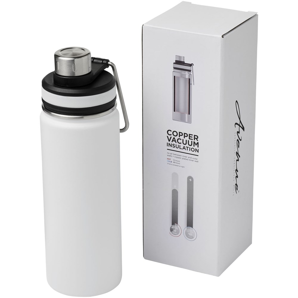 Doppelwandige Edelstahl-Vakuumkonstruktion mit Kupferisolierung, welche dafür sorgt, dass Ihr Getränk mindestens 12 Stunden lang heiß und 48 Stunden lang kalt bleibt. Die Konstruktion verhindert auch eine Kondensation an der Außenseite der Flasche. Ausgestattet mit einem Schraubverschluss und einem Edelstahldeckel mit einem praktischen Tragegriff. Konstruktion mit zwei Öffnungen für einfache Reinigung und Befüllung. Das Fassungsvermögen beträgt 590 ml. Präsentiert in einer Avenue-Geschenkschachtel.