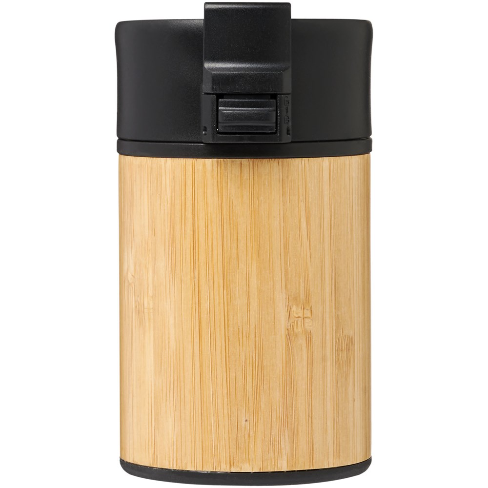 Doppelwandiger vakuumisolierter Becher mit einem Schließdeckel in aufklappbarer Ausführung. Der Becher hat eine doppelwandige Vakuumkonstruktion aus Edelstahl mit Kupferisolierung und einer Außenseite aus natürlichem Bambus. Er hält Getränke 8 Stunden warm und 24 Stunden kalt. Die Konstruktion verhindert außerdem Kondenswasser auf der Außenseite des Bechers. Ein idealer, kompakter und tragbarer Becher für unterwegs. Das Fassungsvermögen beträgt 200 ml. Präsentiert in einer Avenue-Geschenkschachtel.