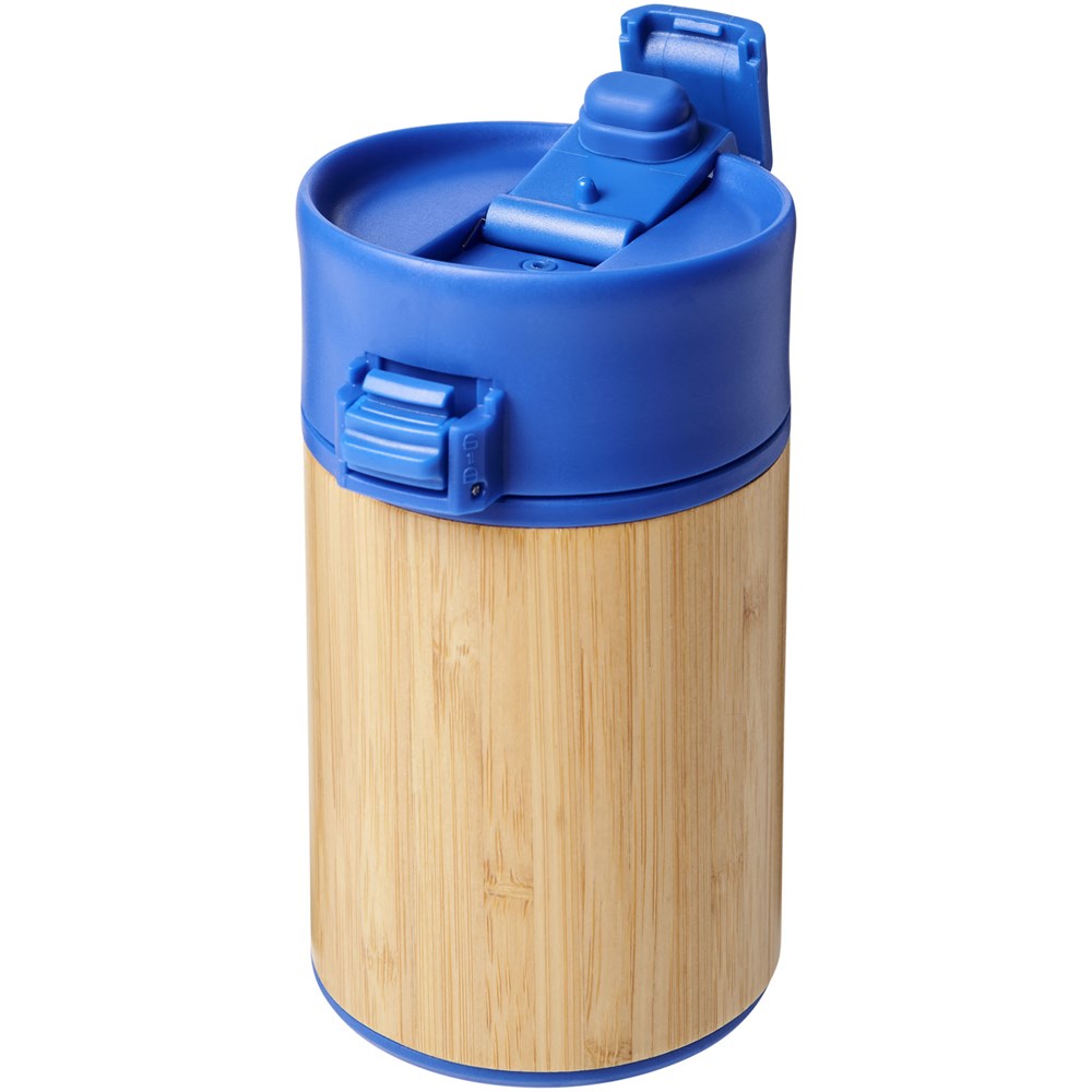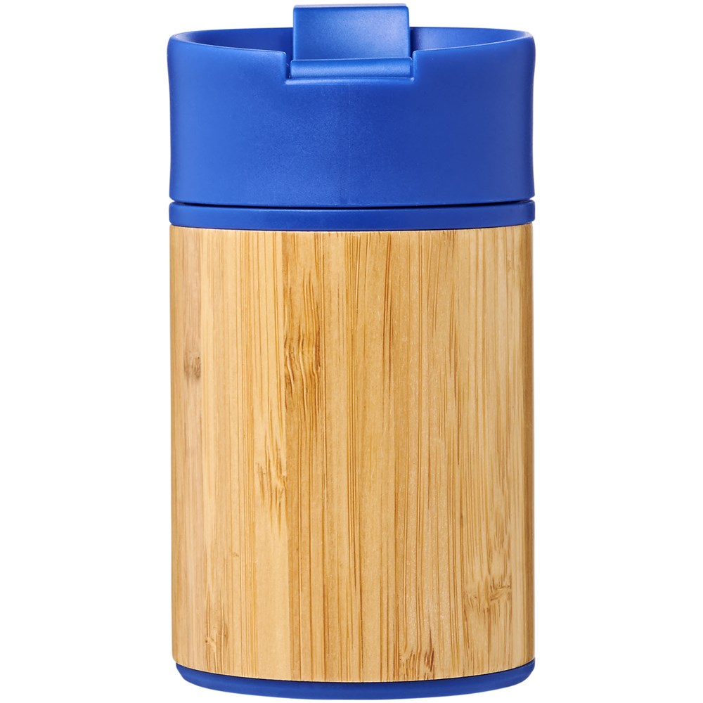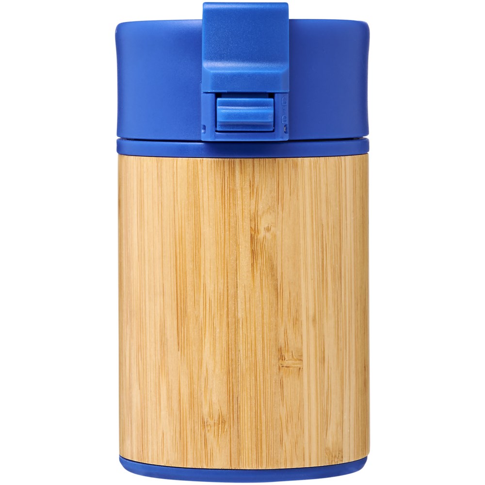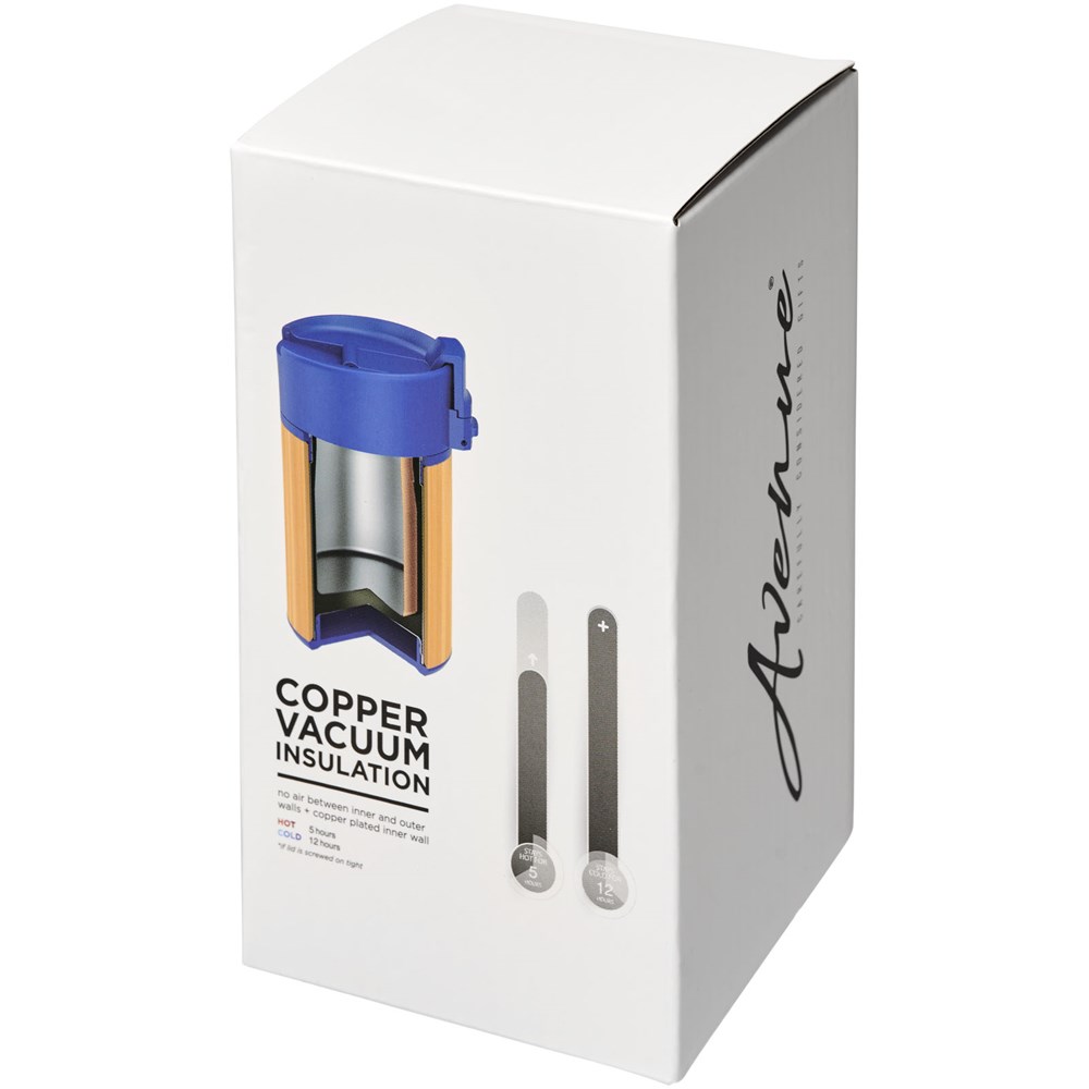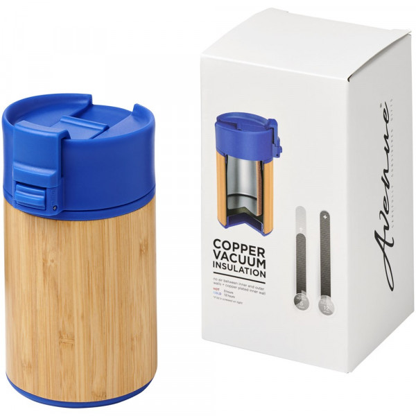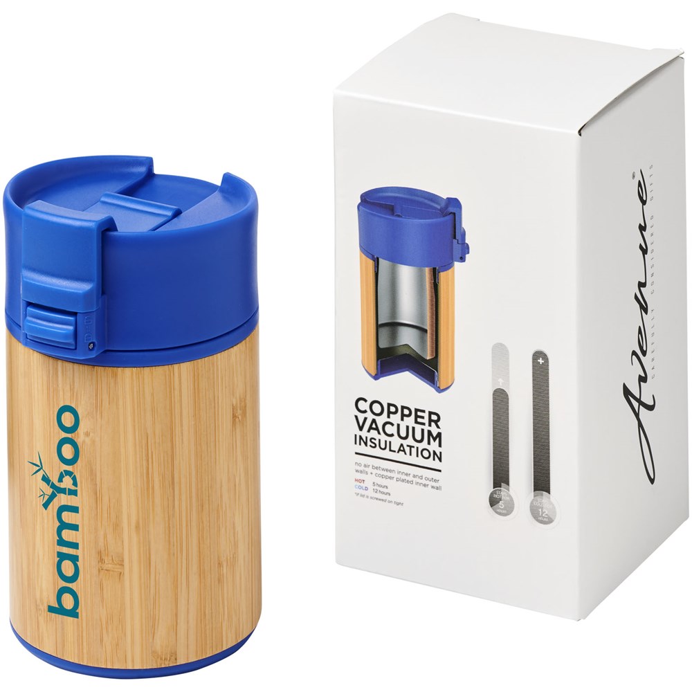 Doppelwandiger vakuumisolierter Becher mit einem Schließdeckel in aufklappbarer Ausführung. Der Becher hat eine doppelwandige Vakuumkonstruktion aus Edelstahl mit Kupferisolierung und einer Außenseite aus natürlichem Bambus. Er hält Getränke 8 Stunden warm und 24 Stunden kalt. Die Konstruktion verhindert außerdem Kondenswasser auf der Außenseite des Bechers. Ein idealer, kompakter und tragbarer Becher für unterwegs. Das Fassungsvermögen beträgt 200 ml. Präsentiert in einer Avenue-Geschenkschachtel.