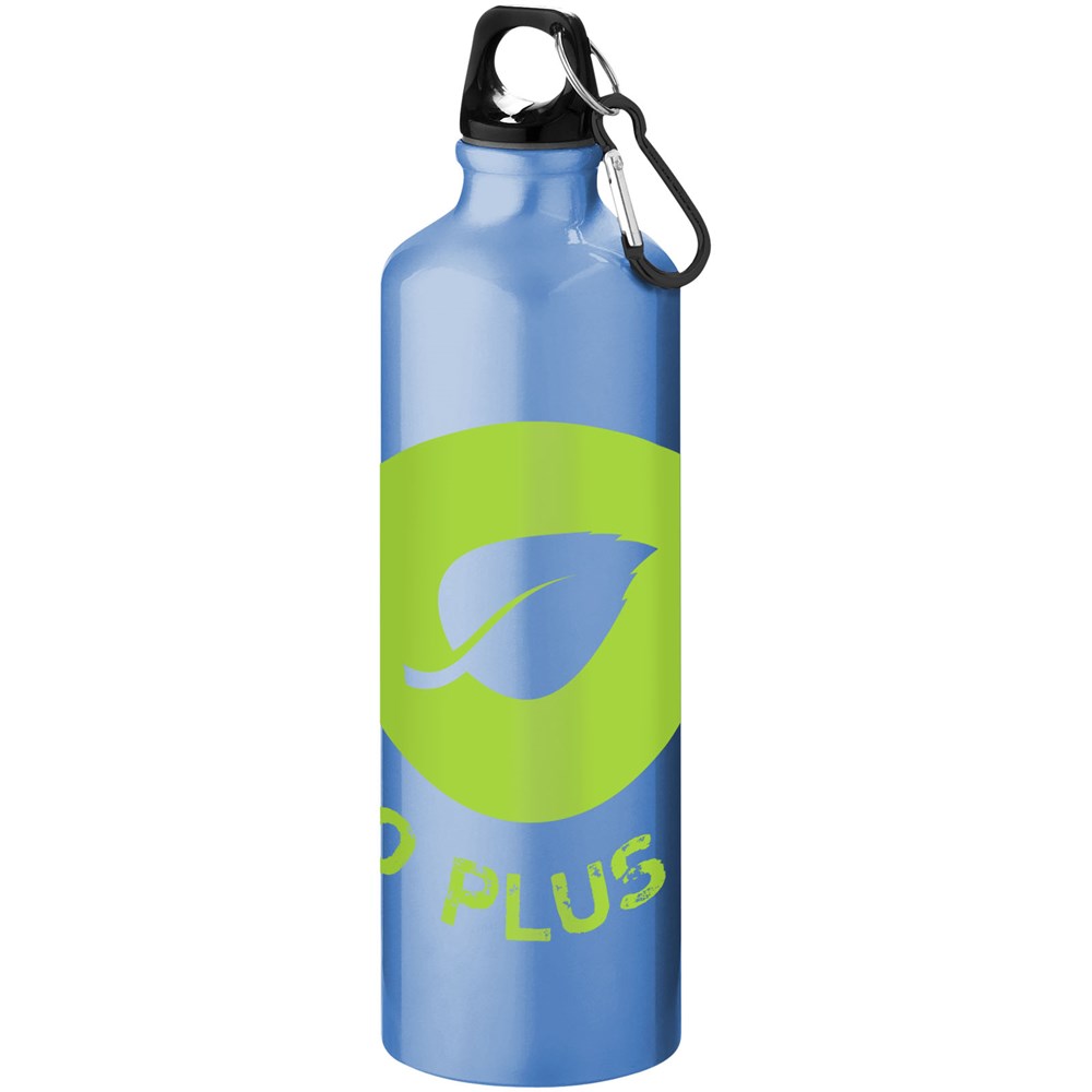 Einwandige Flasche mit Schraubverschluss. Karabiner ist nicht für das Klettern geeignet. Volumen 770 ml.